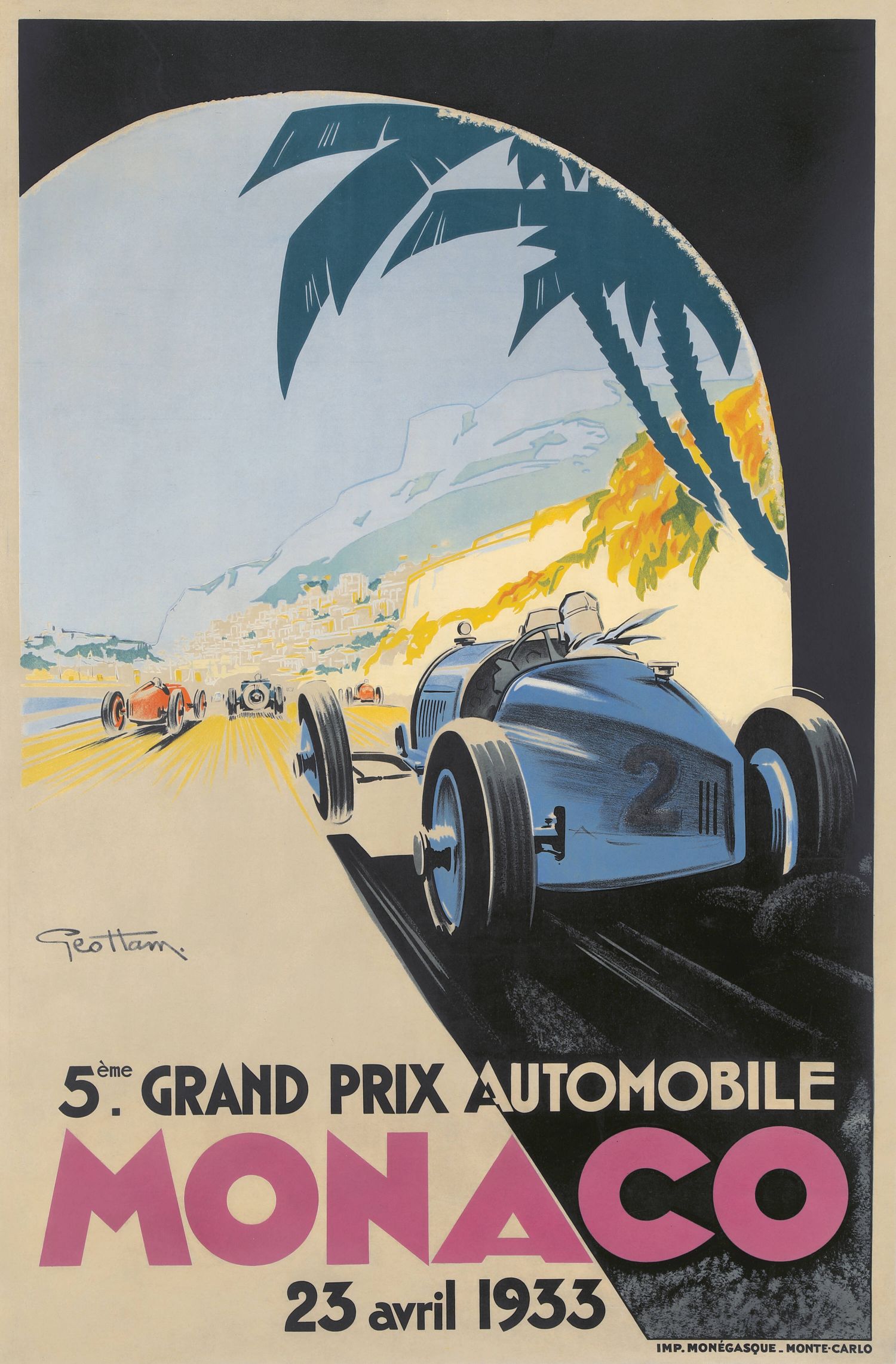Póster de Géo Ham (Georges Hamel, 1900-1972) anuncia el 5º Gran Premio de Automóviles de Mónaco, celebrado el 23 de abril de 1933. Este evento fue notable por ser la primera vez que las posiciones de la parrilla se decidieron por el tiempo de práctica, abandonando el método de votación.