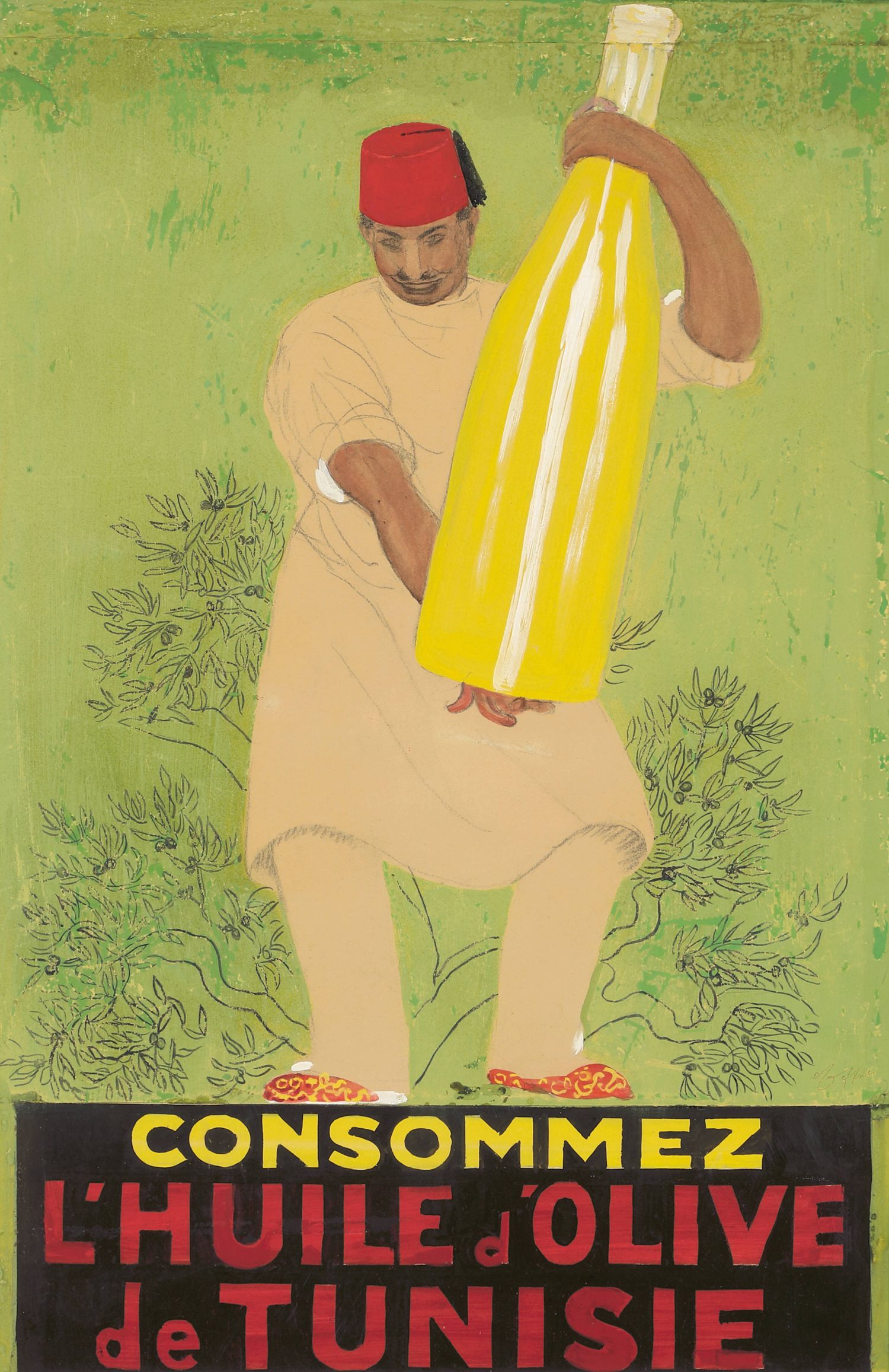 El diseño, de principios del siglo XX, muestra a un hombre tunecino con fez rojo y vestimenta blanca, sosteniendo una botella de aceite exageradamente grande. El cartel indica: CONSUMA ACEITE DE OLIVA DE TÚNEZ (en francés: "CONSOMMEZ L'HUILE D'OLIVE de TUNISIE"), destacando la "Calidad Pura" del producto.
