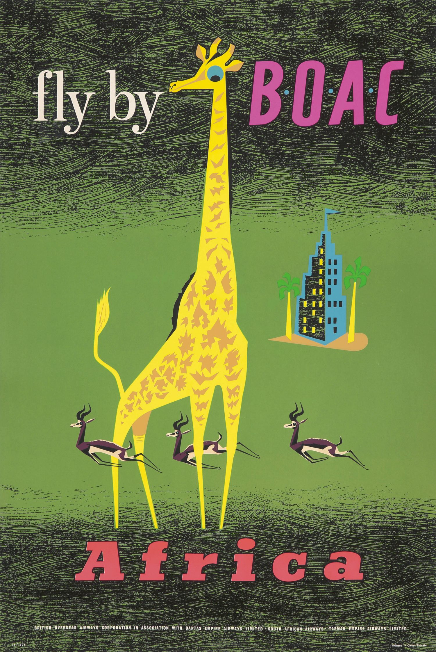 Este cartel de viaje vintage de Maurice Laban, diseñado alrededor de 1956 para BOAC (British Overseas Airways Corporation), promociona vuelos a África. La obra presenta una elegante jirafa junto a varias gacelas en un paisaje africano estilizado. Un edificio moderno en la esquina superior derecha sugiere un destino urbano o turístico. El texto "fly by BOAC" y "Africa" destaca claramente el servicio aéreo y el continente. La parte inferior del cartel menciona la colaboración de BOAC con Qantas Empire Airways Limited y South African Airways.