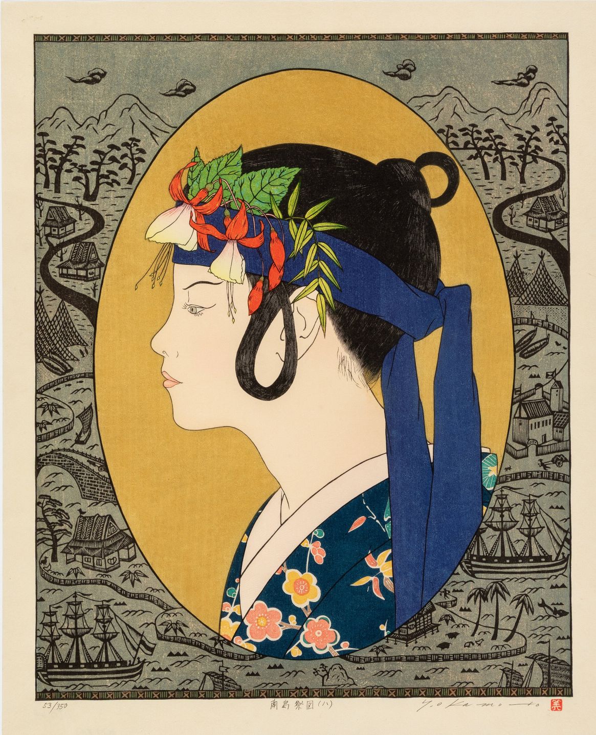 Natou Matsuri Zu-South Island Festival Girl, Okinawa 1982. Por el artista japonés Okamoto Ryusei, nacido en Muroran, en la provincia de Hokkaido, en el año 1949, es una de las obras en los inicios de la carrera de Okamoto. El retrato contemporáneo de una belleza vestida para un festival en Okinawa, con kimono azul marino y estampado de flores y hojas exóticas.