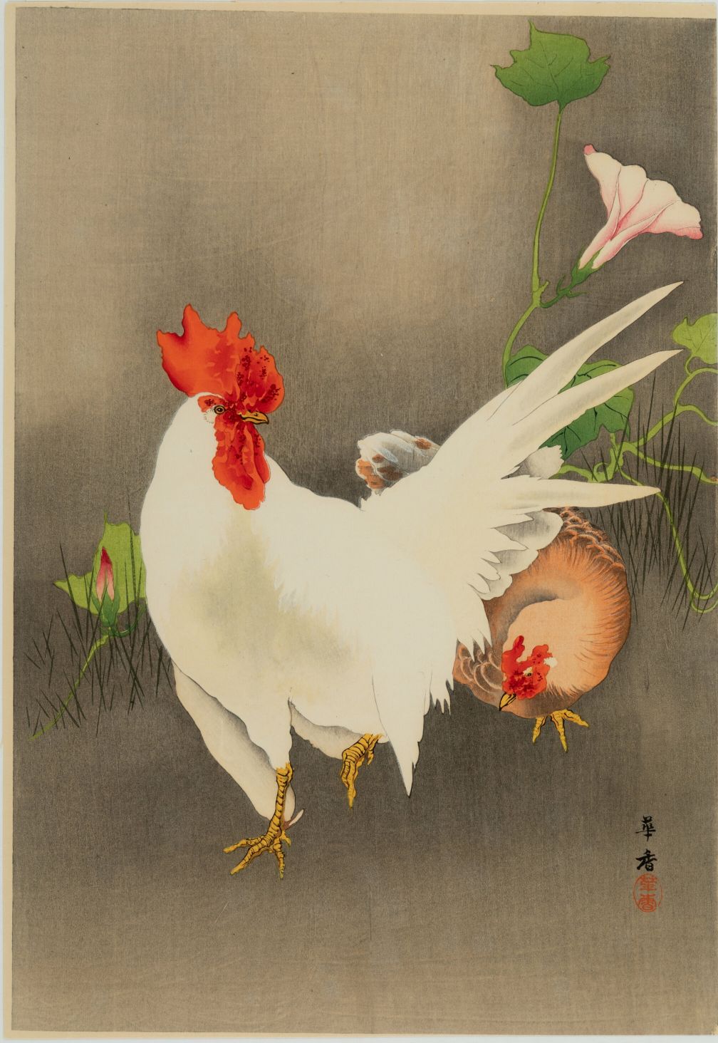 Esta obra del artista japonés Tsuji Kakō (1870–1931), titulada Gallo y Gallina (鶏), es una delicada representación que destaca por su equilibrio entre la tradición y la innovación. La escena muestra a un gallo blanco de majestuosa cresta roja junto a una gallina de tonos rojizos, ambos retratados con gran precisión y vitalidad. La composición, enriquecida por detalles botánicos como una flor de gloria de la mañana, evoca una escena rural serena y armoniosa.