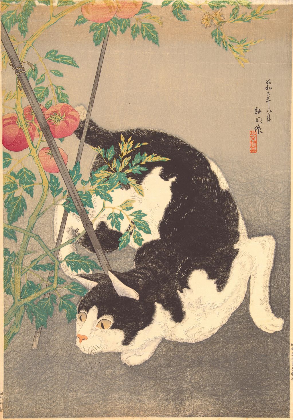 La obra fue creada en 1931, y destaca por su meticuloso detalle en el pelaje del felino, así como en el follaje de la planta, además de un delicado delineado y los sutiles gradientes de color. Esta expresión artística de Hiroaki, nacido en Tokio, Japón, nos muestra un gato blanco con negro enroscado alrededor de una plata de tomate con frutos maduros y el verde vibrante follaje.
