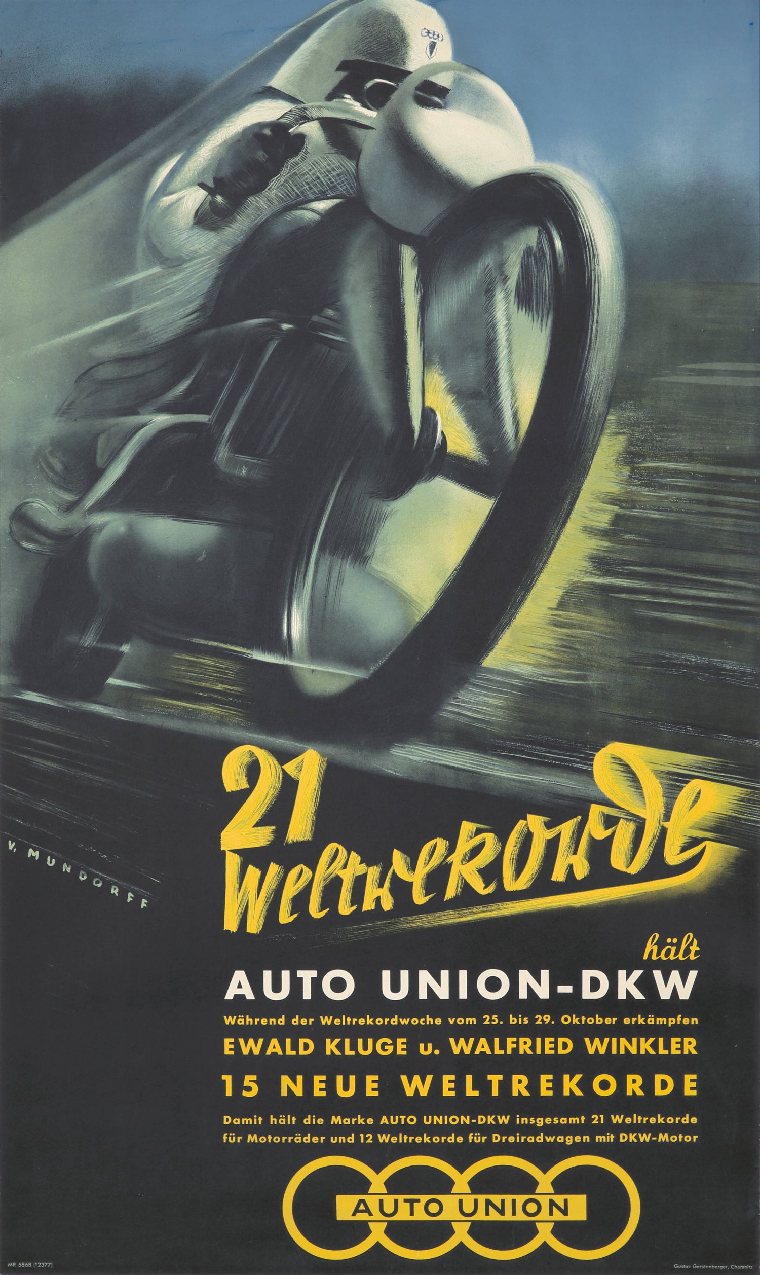 P óster vintage publicitario del año 1938 para Auto Union DKW , creado por Victor Mundorff (1897-1973) celebrando los récords mundiales…