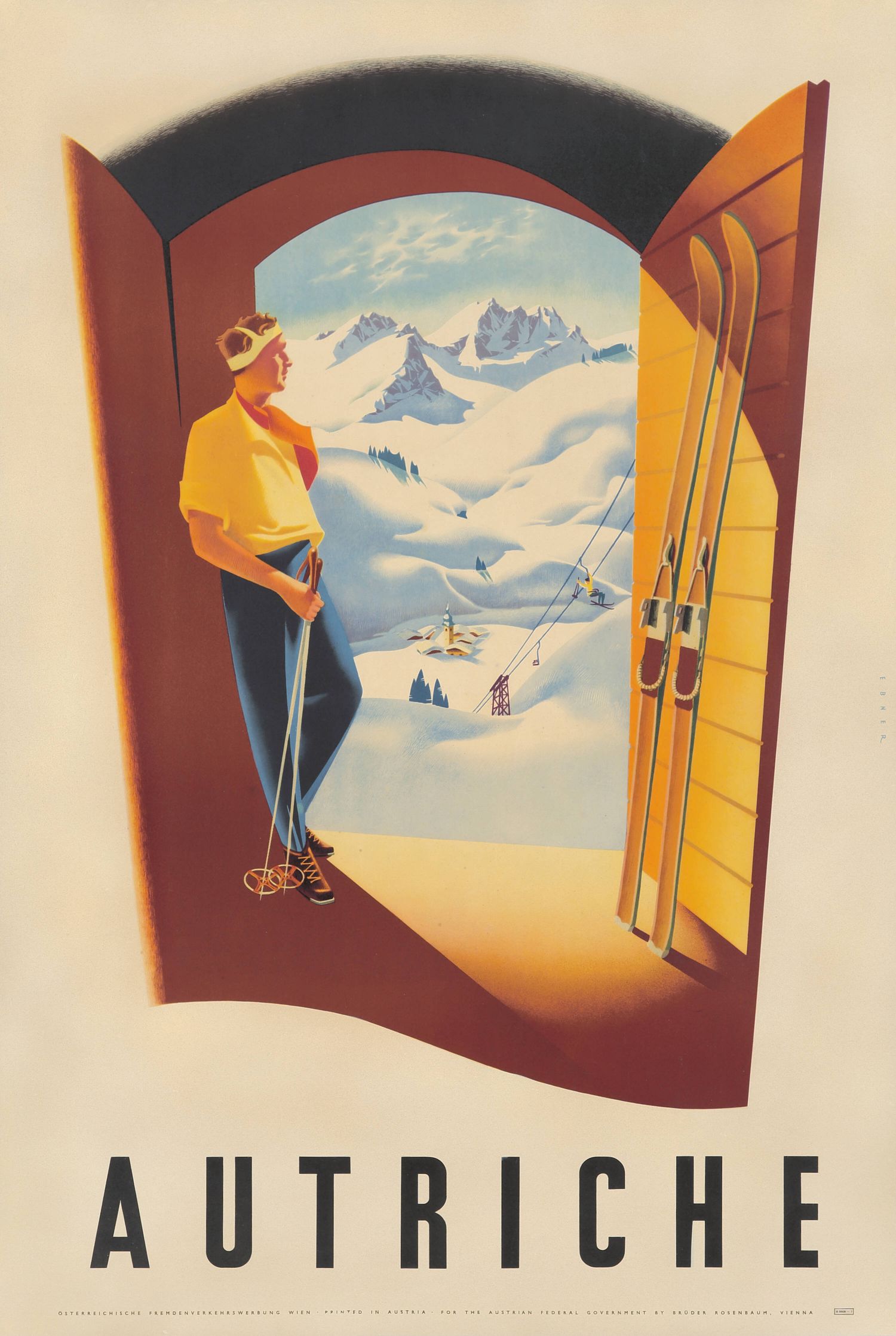 Este cartel vintage, titulado "Autriche" (Austria), de Emil Ebner (1897-1989) es una pieza publicitaria diseñada en 1950, que promueve a Austria como destino para deportes de invierno. Muestra a una persona con ropa de esquí admirando un paisaje montañoso nevado con remontes, sugiriendo la belleza y las actividades de las estaciones austriacas. Estos carteles buscaban atraer turistas destacando la emoción del esquí y los paisajes invernales.