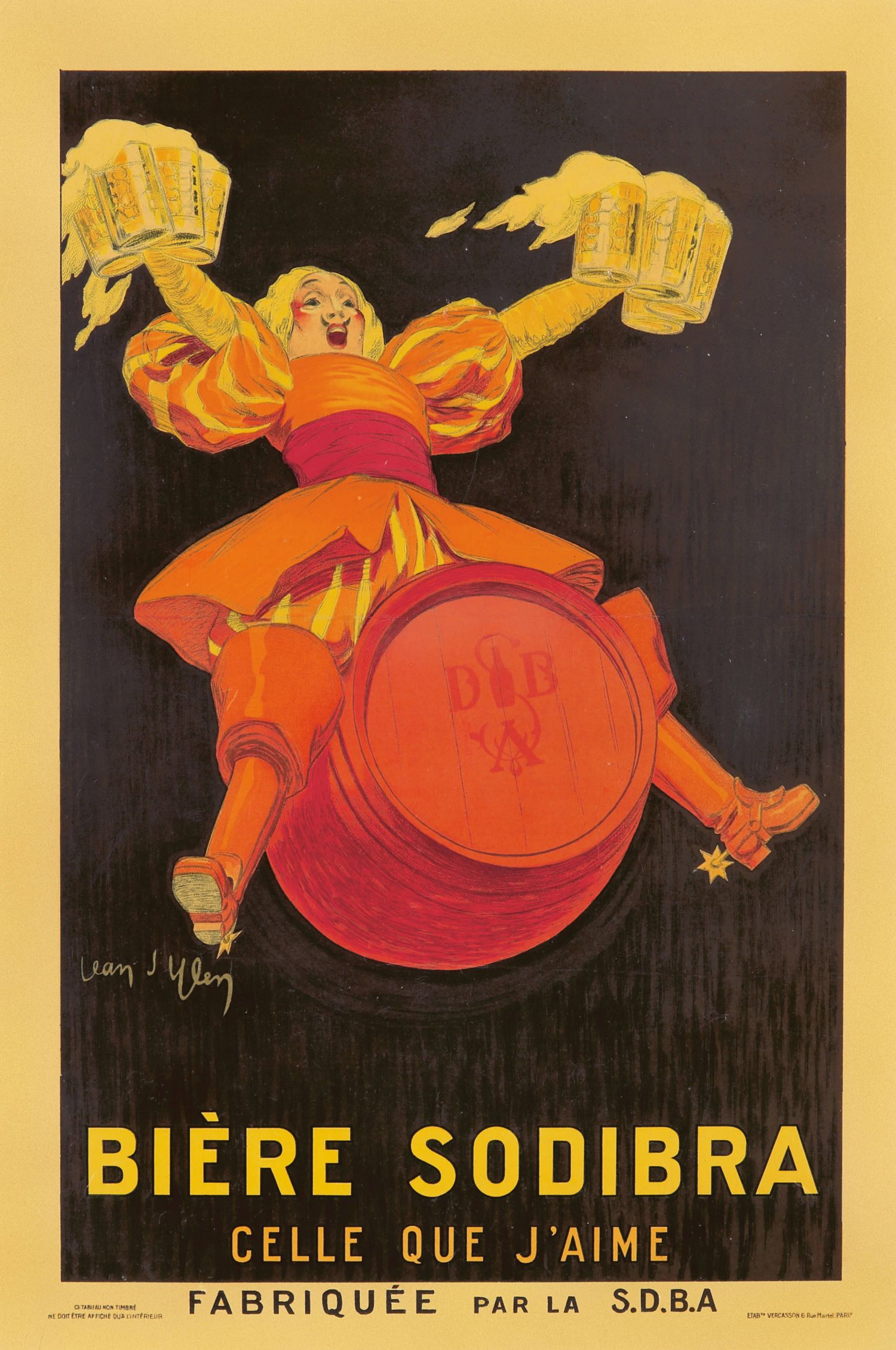 Póster publicitario antiguo de Cerveza Sodibra (traducido al francés, "Bière Sodibra"), una cerveza francesa. Aunque el cartel está firmado como "Lean J. Glen", se atribuye al reconocido artista Jean d'Ylen (1886-1938), lo que sugiere que podría ser un seudónimo o una variación de su firma.