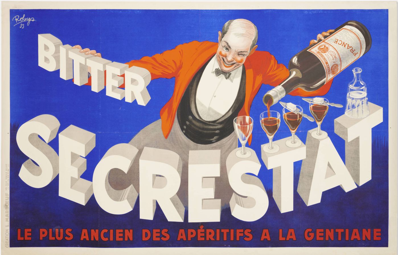 Este póster publicitario vintage de 1935 para "Bitter Secrestat", un aperitivo francés a base de genciana, fue creado por el artista Robys (…