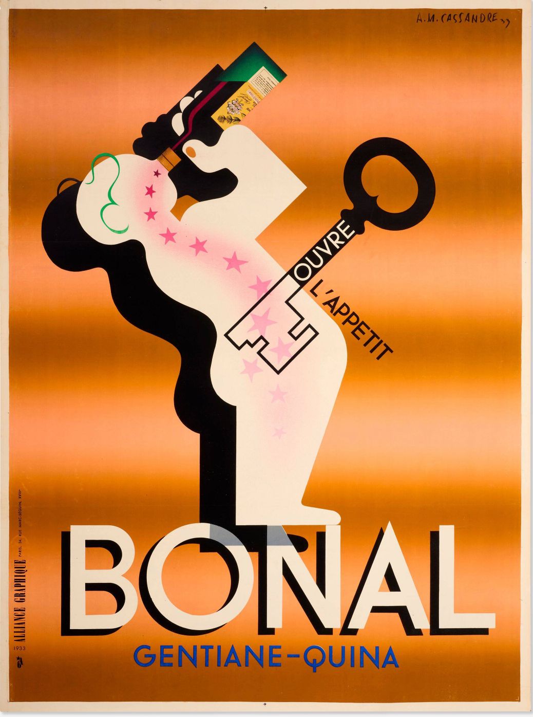 Póster publicitario de Bonal Gentiane-Quina, un aperitivo francés. La obra es de Adolphe Jean-Marie Mouron (1901-1968), más conocido como A. M. Cassandre, un influyente diseñador gráfico.