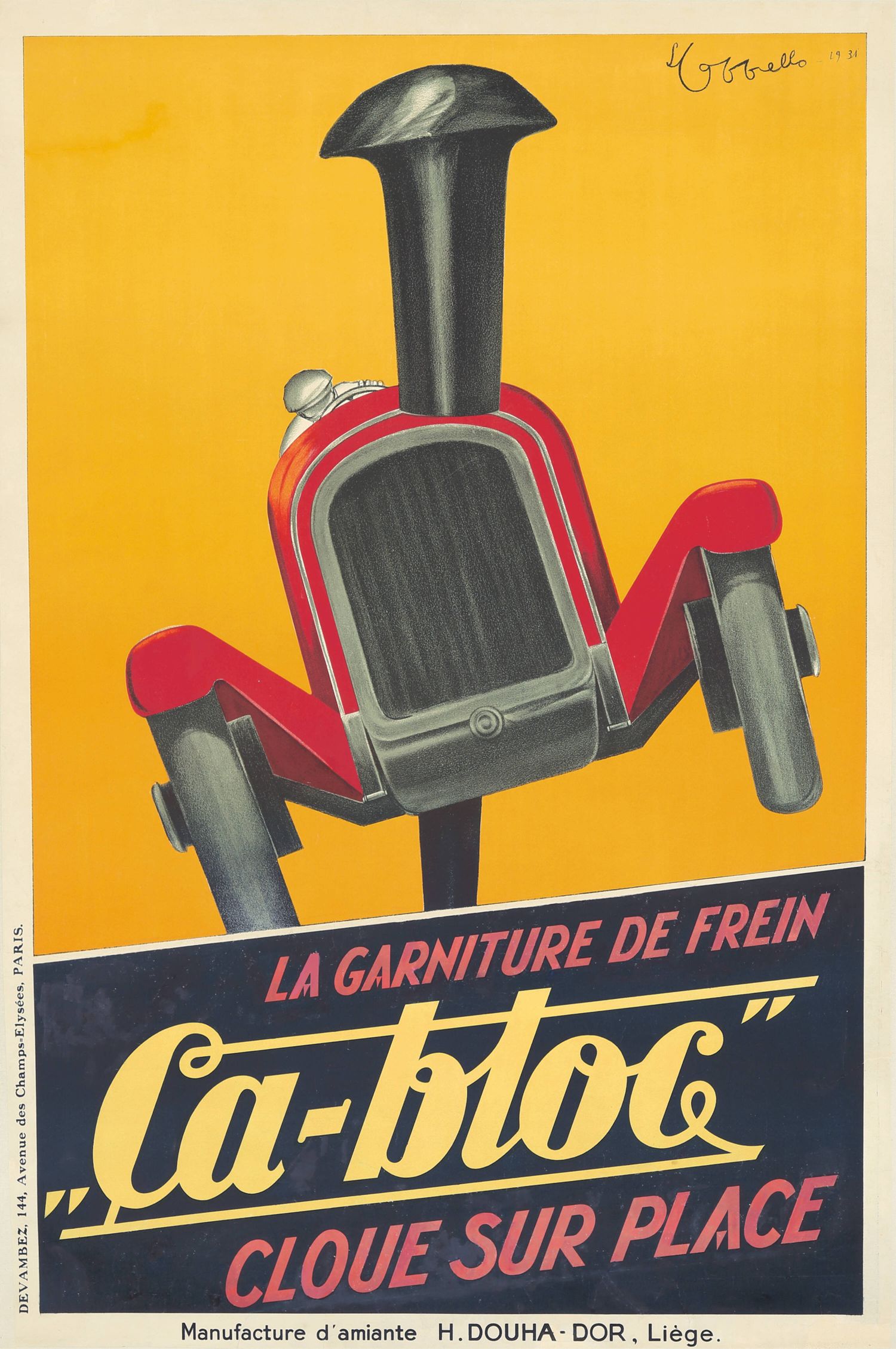 Póster publicitario vintage de Leonetto Cappiello (1875-1942), creado en 1931, promociona los forros de freno para automóvil de la marca "Ca-bloc". Fabricado por Manufacture d'amiante H. DOUHA-DOR en Lieja, y distribuido/impreso por DEVAMBEZ en París, el póster destaca el eslogan "La Garniture de Frein Ca-bloc Cloue Sur Place" (El forro de freno Ca-bloc te clava en el sitio), resaltando la eficacia de este componente automotriz.