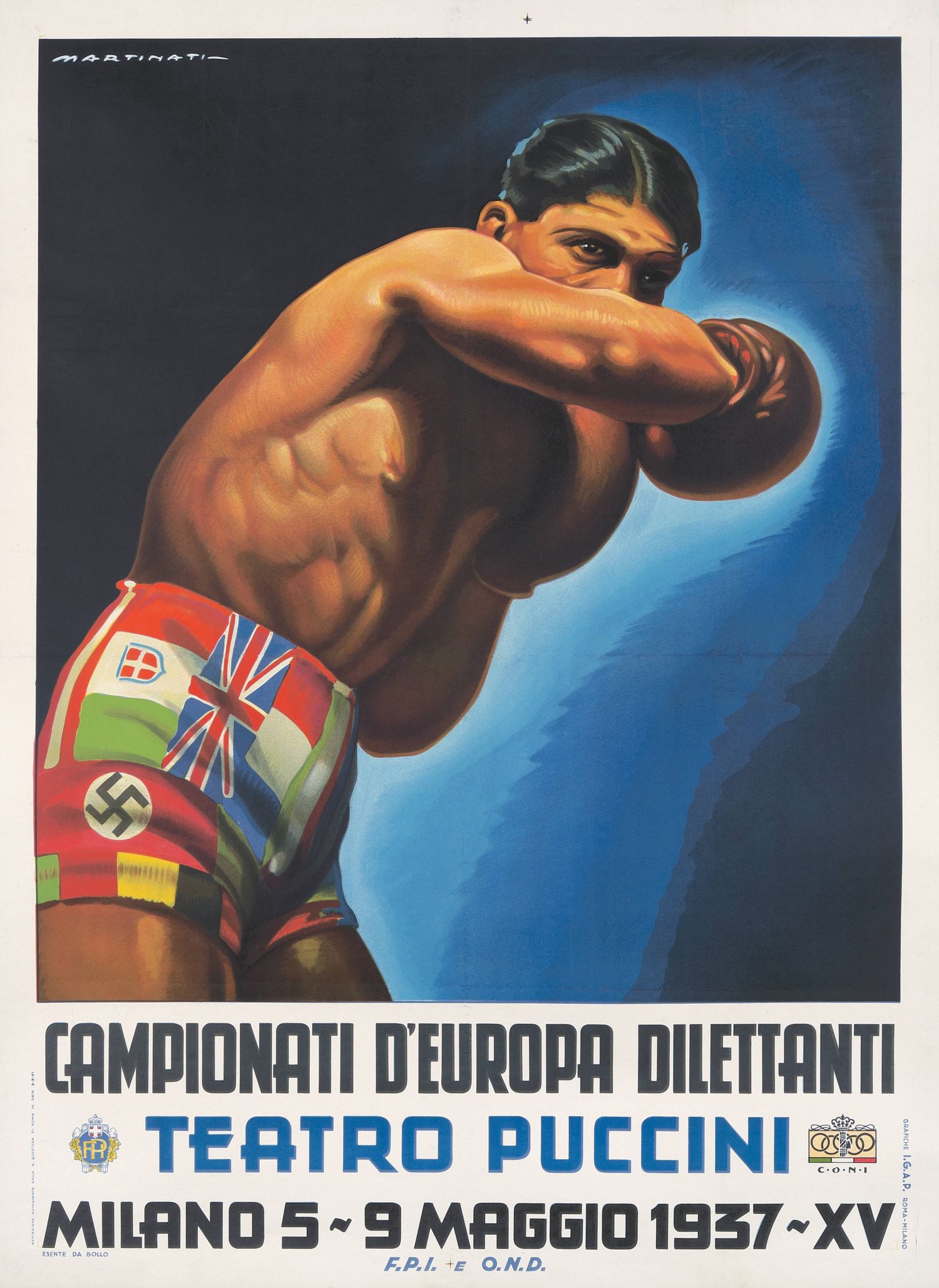 Este póster, diseñado por Martino M. Martini, anuncia los Campeonatos de Europa de Boxeo Aficionado, que se celebraron en el Teatro Puccini de Milán, Italia, del 5 al 9 de mayo de 1937. El evento fue organizado por la Federación Italiana de Pugilato (F.P.I.) y la Opera Nazionale Dopolavoro (O.N.D.).
