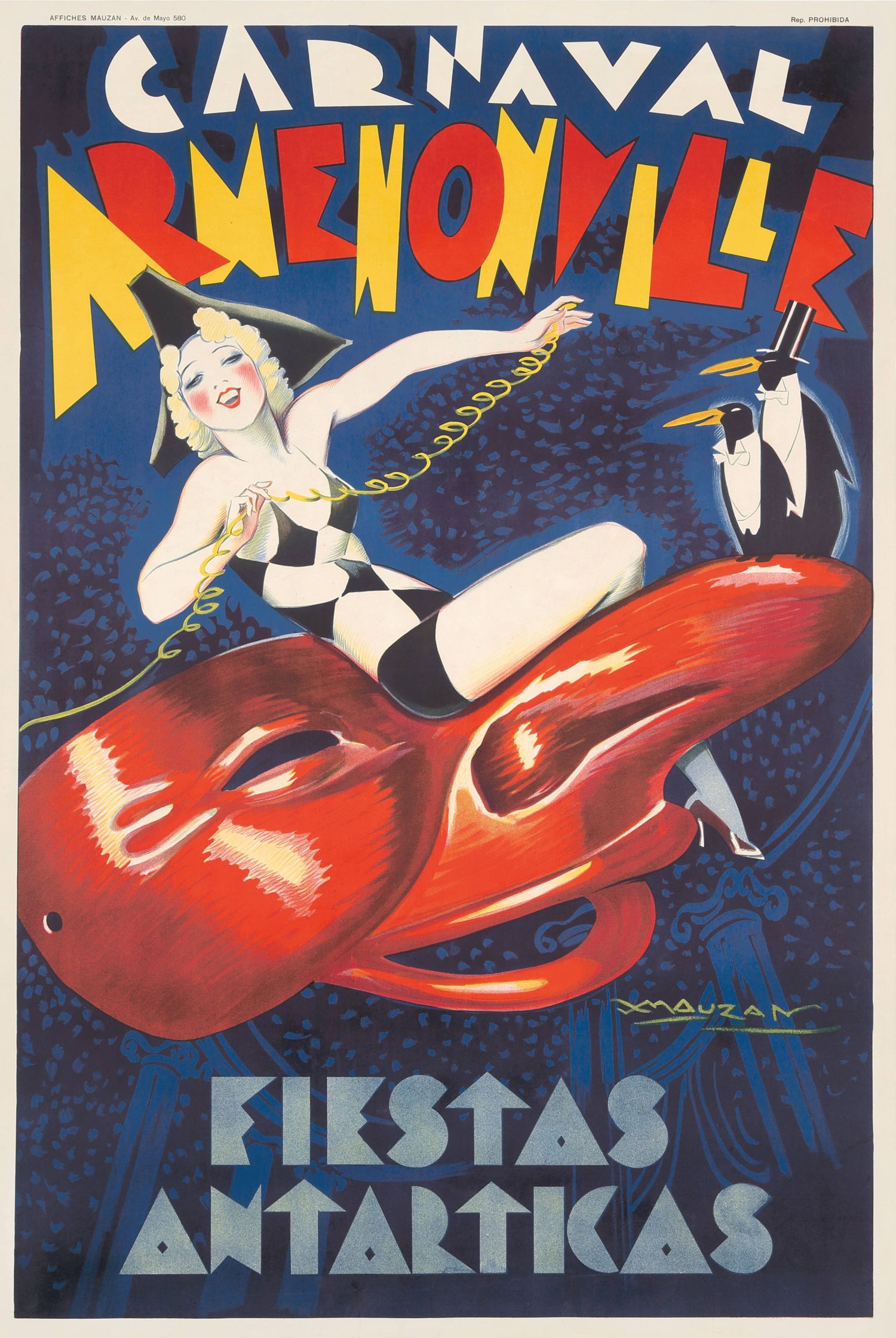 Un cartel promocional de las "Fiestas Antárticas" del Carnaval Armenonville, dónde podemos apreciar a una figura femenina con un traje a cuadros, y un sombrero puntiagudo, sentada sobre una máscara roja, con pingüinos parados sobre la nariz de la máscara, esto aludo al tema "Antárticas" que se vivió en la fiesta.