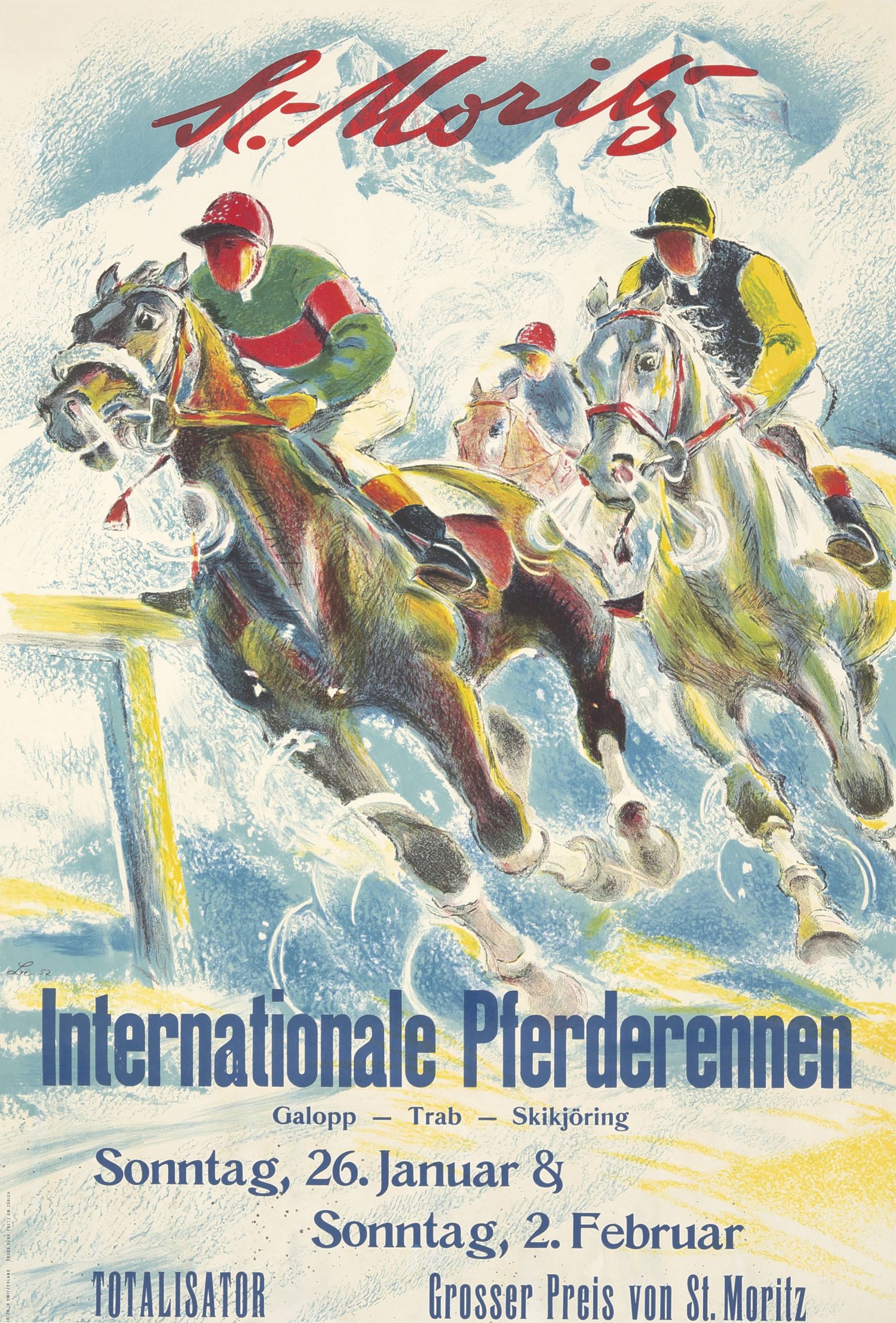 Este cartel vintage de Hugo Laubi (1888-1959) anuncia las Carreras Internacionales de Caballos en St. Moritz, Suiza. El evento, que se…