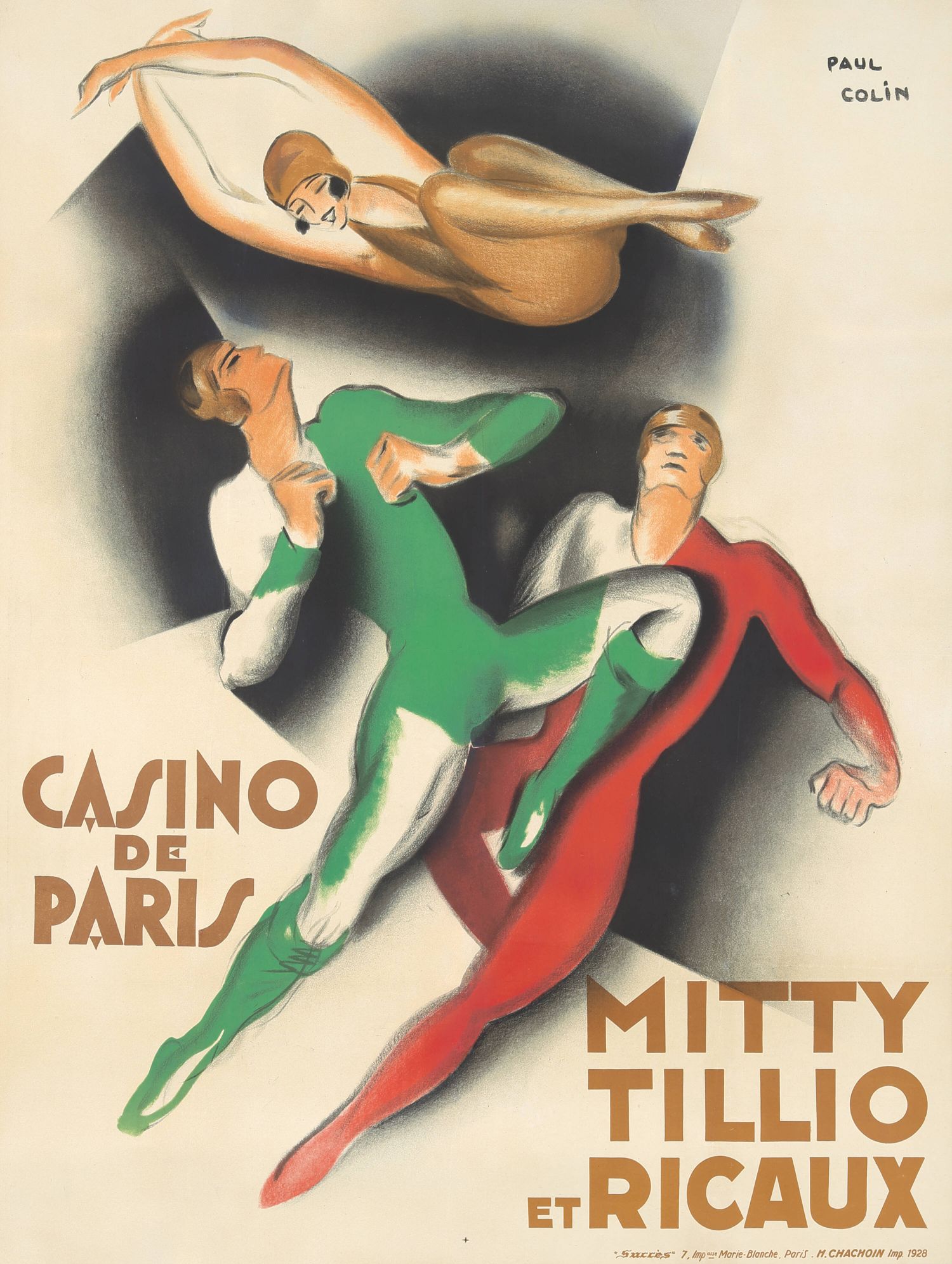 Este cartel de Paul Colin de 1928 anuncia una revista o espectáculo en el famoso "Casino de Paris", destacando a los artistas Mitty Tillio y Ricaux como protagonistas. Colin, un renombrado diseñador gráfico francés del estilo Art Decó, creó esta pieza que refleja su talento para la publicidad teatral. El cartel captura la esencia del entretenimiento parisino de la época.