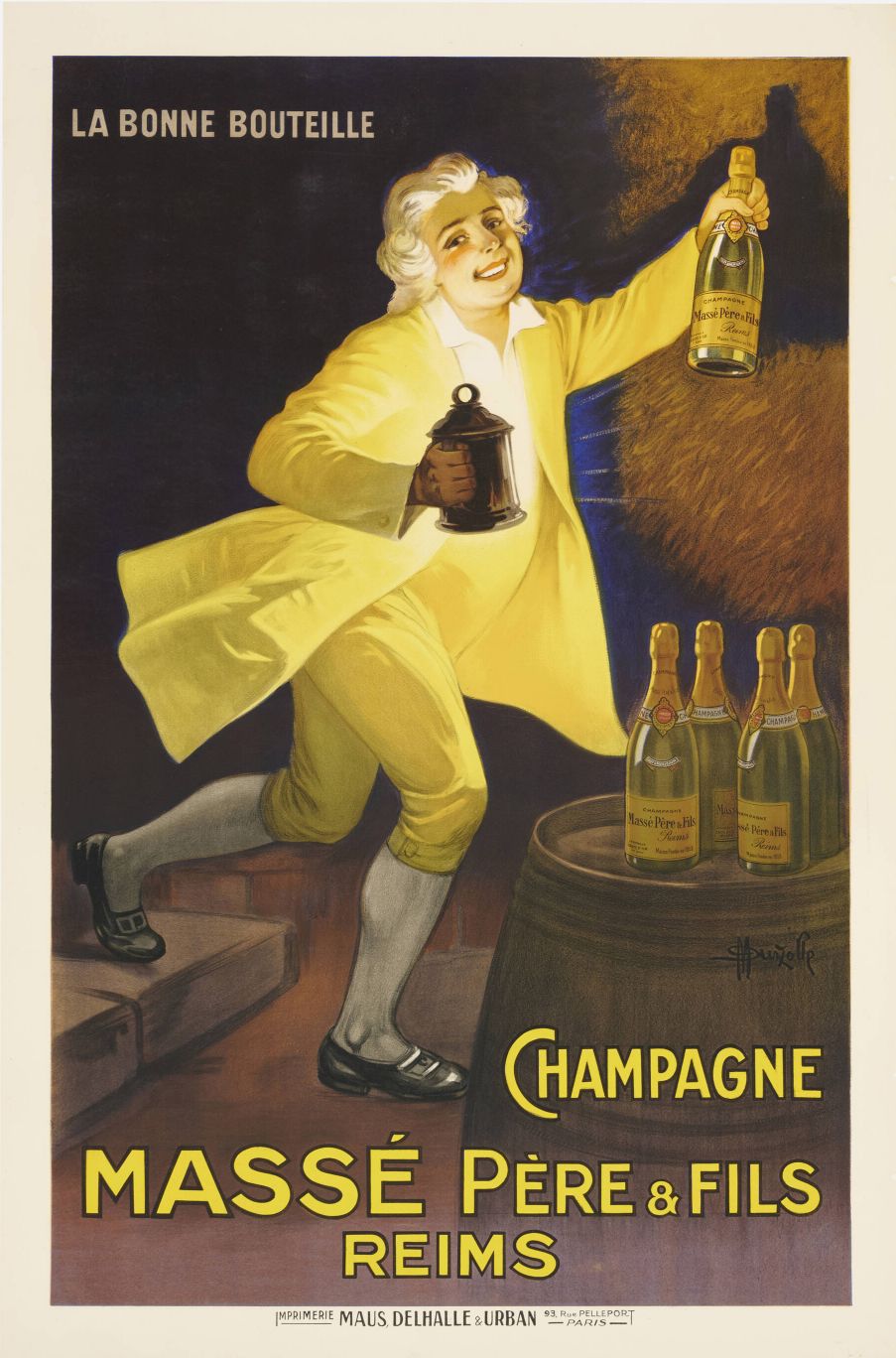 Este cartel publicitario antiguo para Champagne Massé Père et Fils de Reims es obra del artista francés Marcellin Auzolle (1862–1942). Impreso en París por Maus, Delhalle et Urban (sin fecha, pero estimado alrededor de 1920), el póster es una pieza que promociona este reconocido champagne.