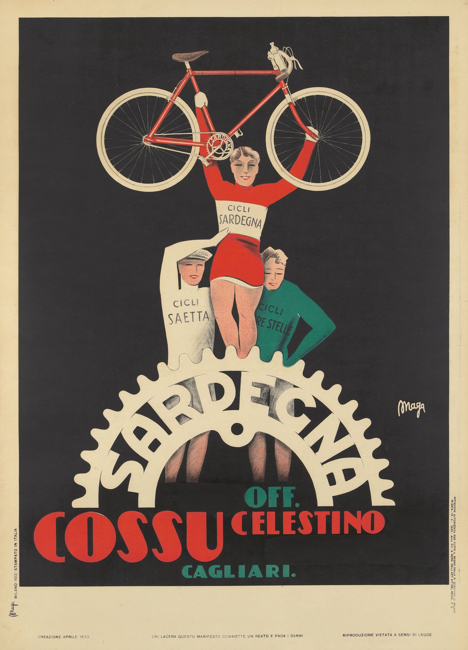 Este cartel publicitario antiguo de la marca de bicicletas italiana "Cicli Cossu Sardegna" es obra del artista Maga, cuyo nombre aparece…