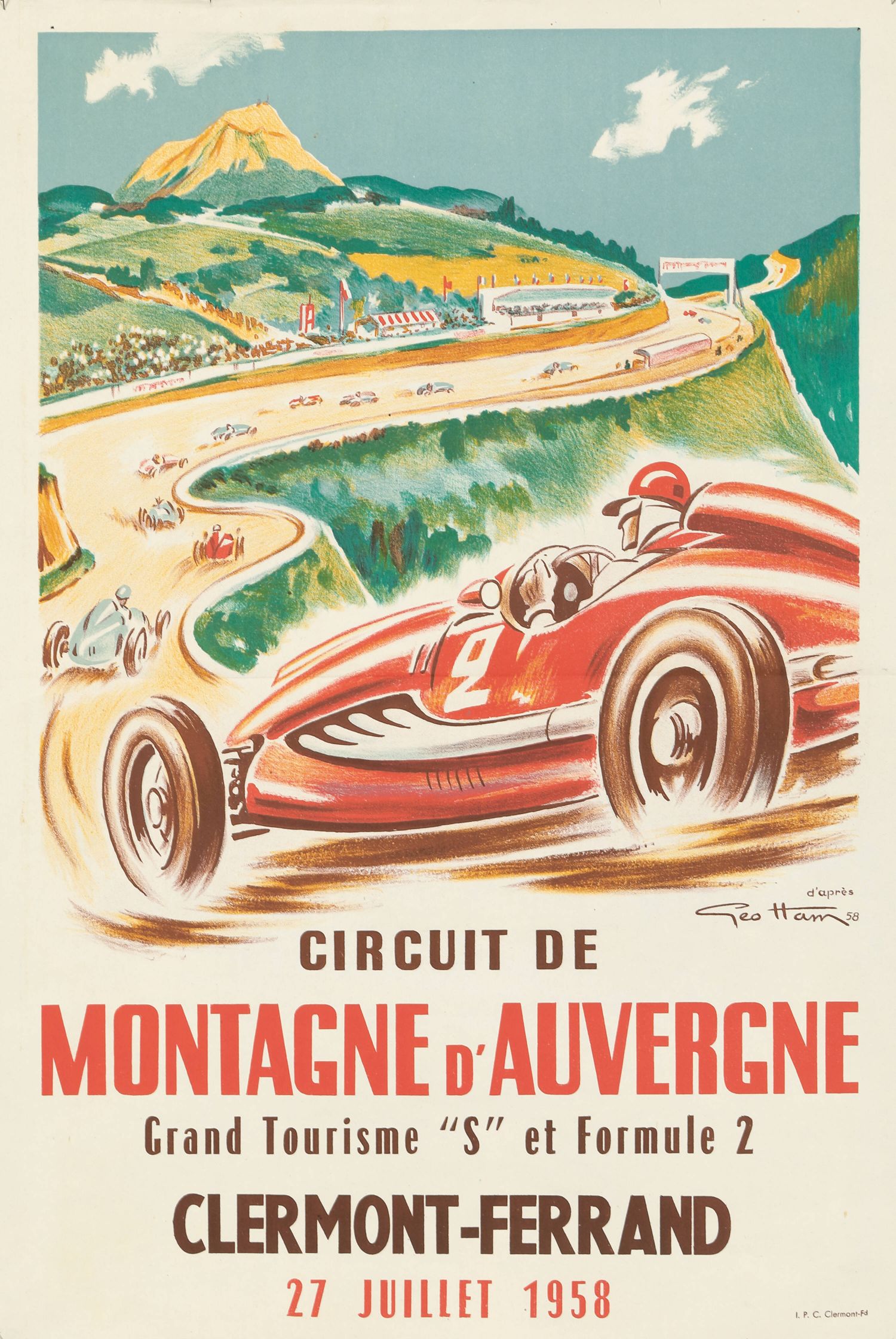 Este es un cartel vintage que anuncia el "Circuit de Montagne d'Auvergne" en Clermont-Ferrand, Francia. El evento se celebró el 27 de julio de 1958 e incluyó emocionantes carreras de "Grand Tourisme 'S'" y "Formule 2". El cartel fue diseñado por Géo Ham (Georges Hamel, 1900-1972).
