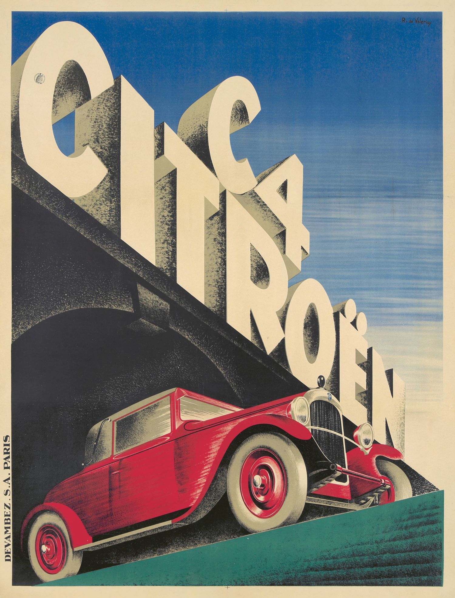 Este cartel publicitario vintage de Roger de Valerio (1886-1951) promociona el modelo francés Citroën C4, un automóvil diseñado para…