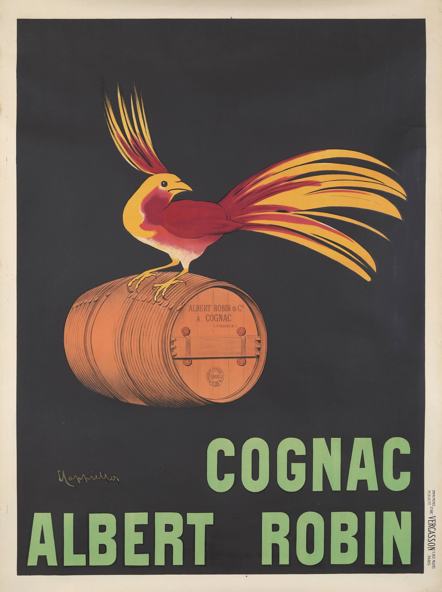 El diseño de Cappiello utiliza colores llamativos y figuras grandes sobre fondos oscuros, con formas arabescas para captar la atención. La firma Cognac Albert Robin, establecida en 1860, se especializó en ventas internacionales. El ave vibrante sobre el barril se convirtió en el logotipo de la empresa. Este cartel original es una pieza de colección en excelente estado.