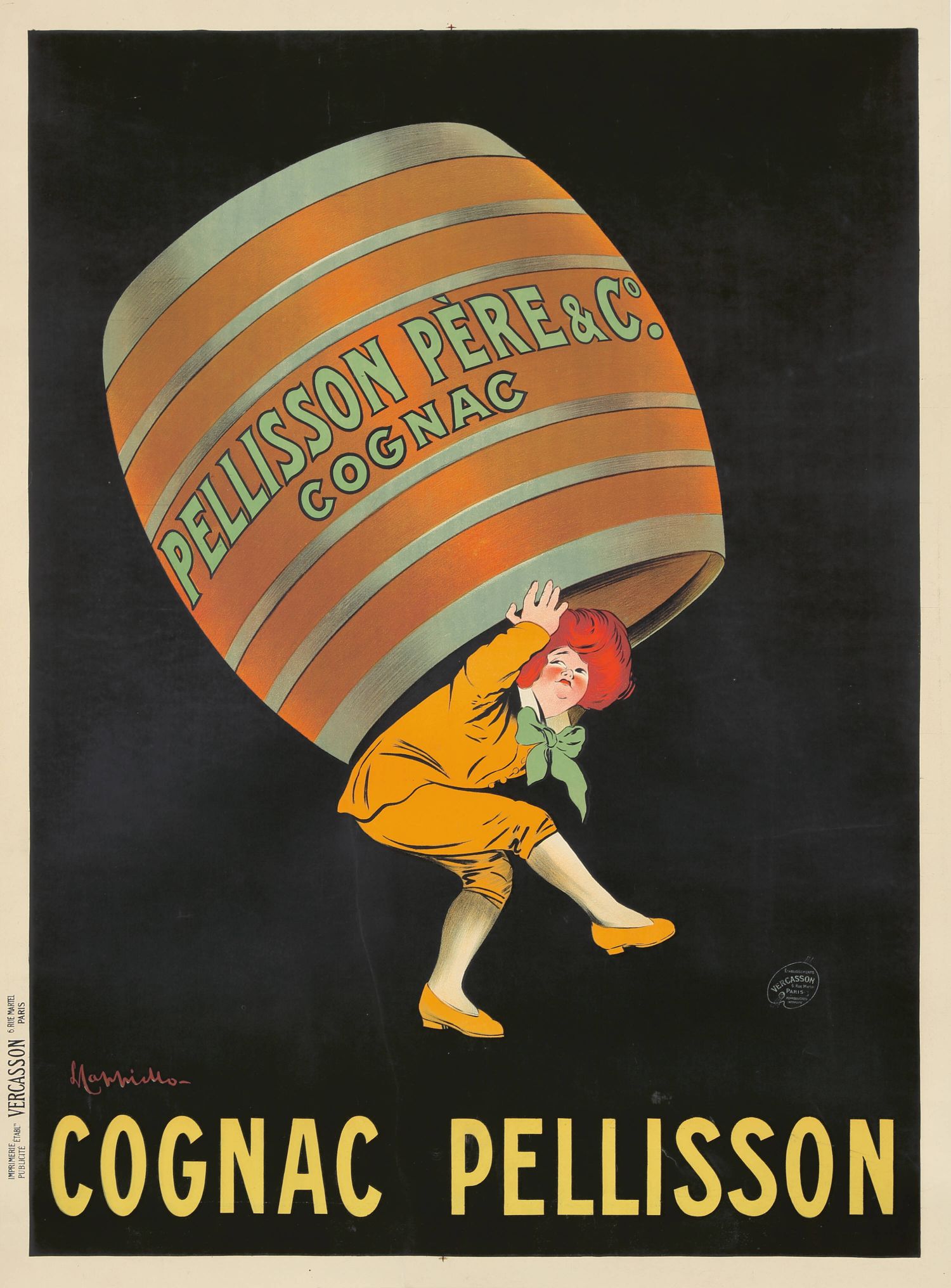 El cartel promociona Cognac Pellisson, una marca de coñac francés. Presenta un diseño típicamente caprichoso de Cappiello, con una figura dinámica que parece sostener un barril de coñac de gran tamaño. El uso hábil de un objeto central sobredimensionado ayuda a enfocar al espectador en el producto y es un motivo distintivo del arte de Cappiello.