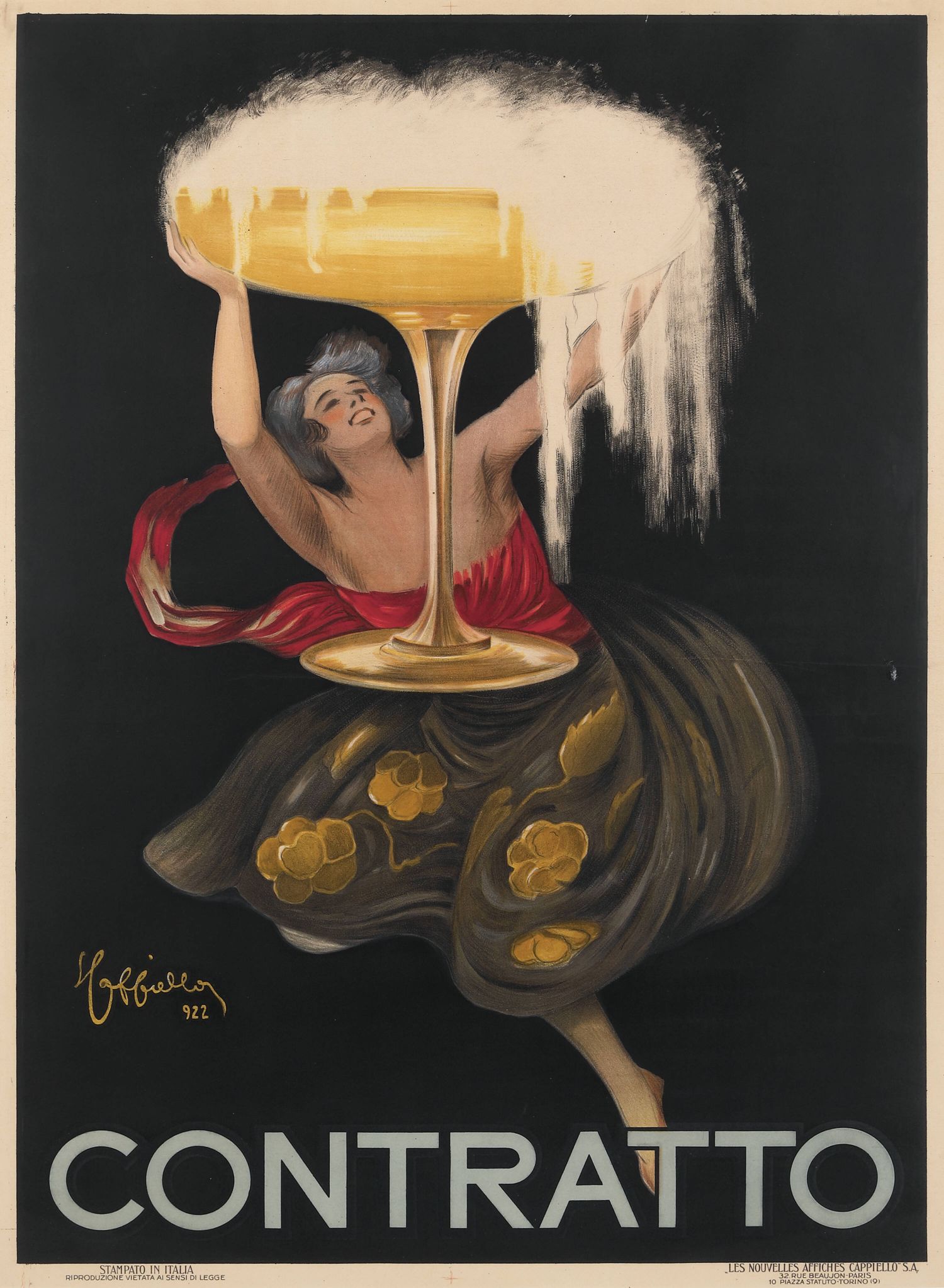 Leonetto Cappiello es reconocido como "el padre de la publicidad moderna" por su innovador diseño de carteles, caracterizado por figuras dinámicas y vibrantes sobre fondos simples. El cartel de Contratto de 1922 presenta a una mujer sosteniendo una copa de vino espumoso rebosante, evocando celebración y alegría.