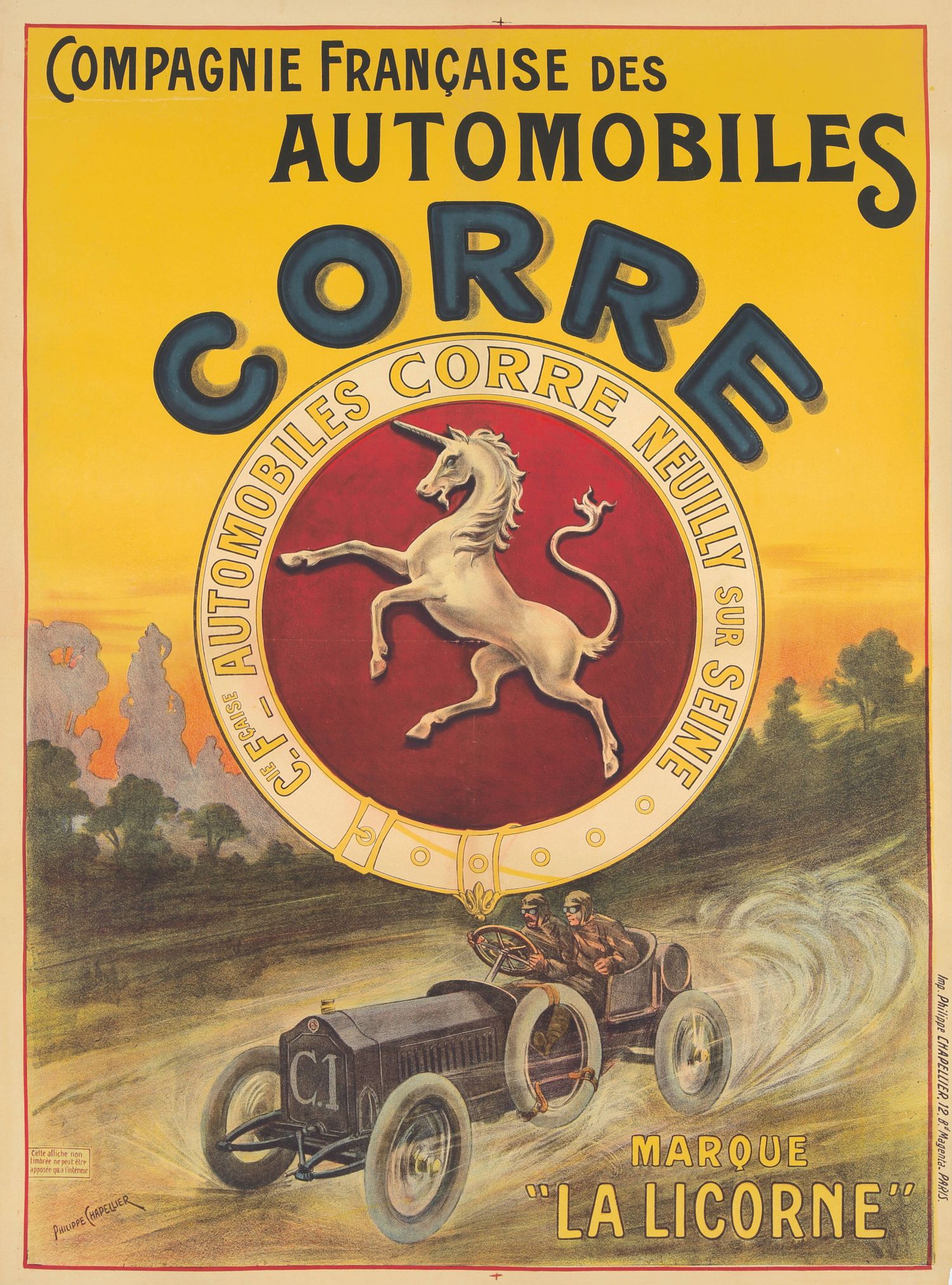 La imagen muestra un cartel publicitario antiguo de la marca de automóviles francesa Corre La Licorne , diseñado por Philippe Chapellier (…