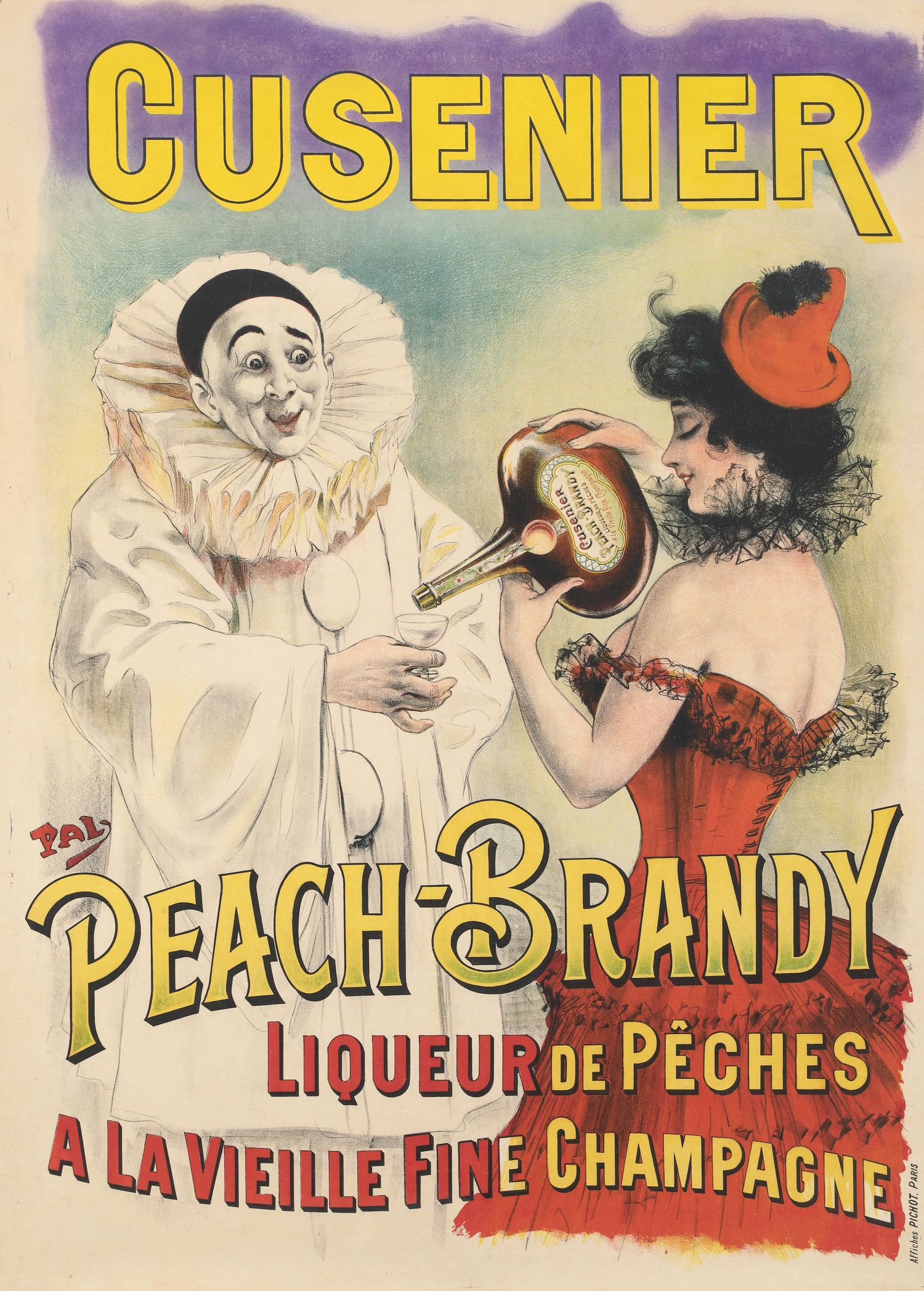 Esta imagen es un póster publicitario antiguo de "Cusenier Peach Brandy", diseñado por Jean de Paleologu (1855–1942), quien firmaba con su clásico "PAL".