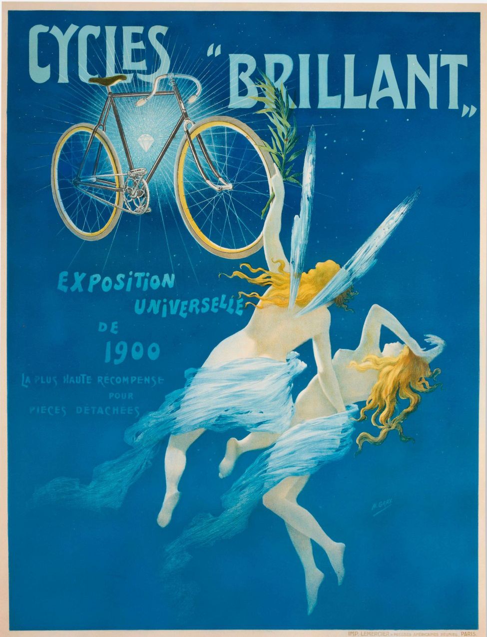 Póster vintage de "Cycles Brillant" es un vibrante anuncio creado por Henri Gray (Henri Boulanger, 1858-1924) en 1899, para la Exposición Universal de 1900. El diseño Art Nouveau representa dos figuras aladas celestiales, que parecen adorar una bicicleta iluminada, simbolizando la innovación, la elegancia y la excelencia de esta marca francesa de principios del siglo XX.