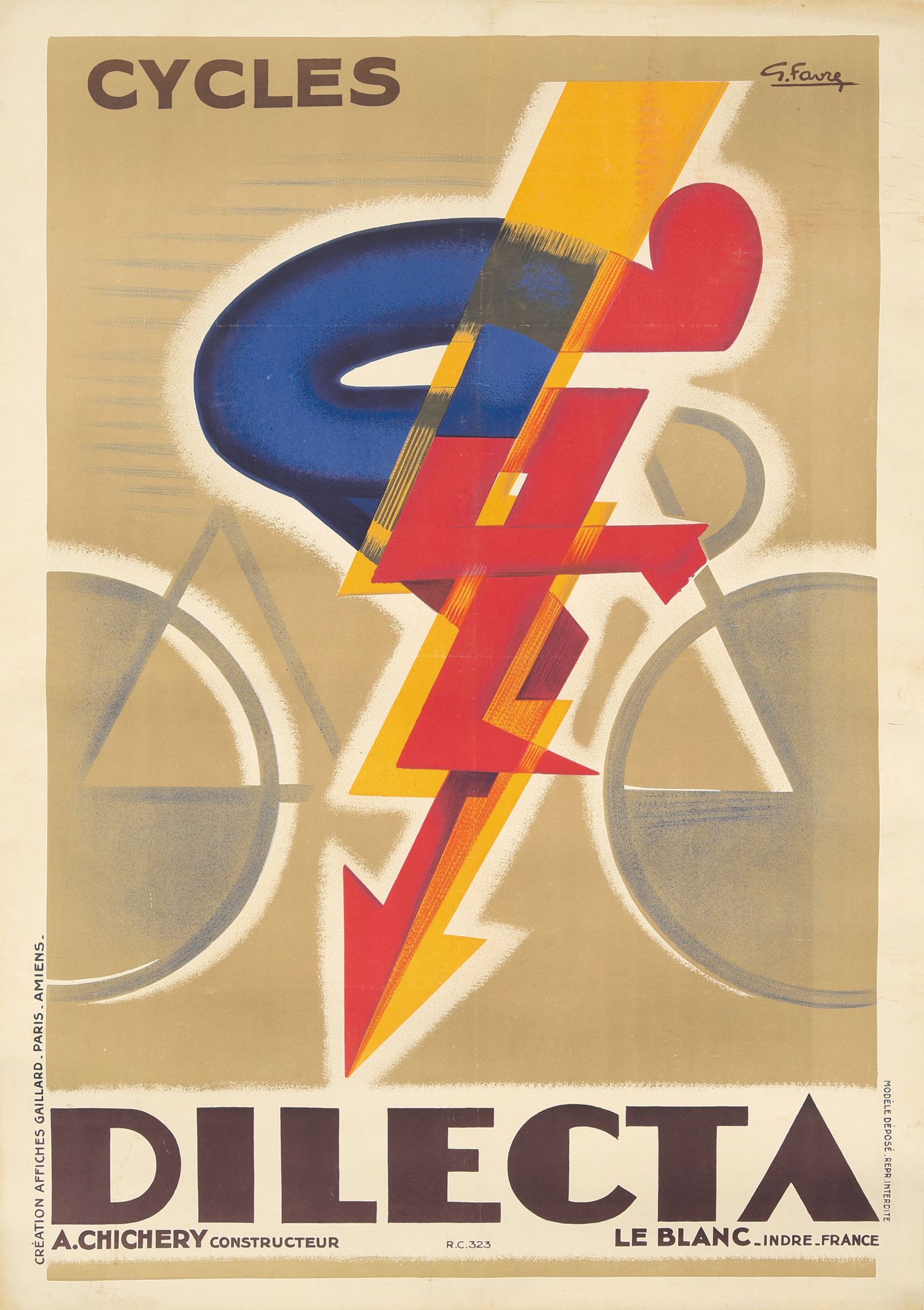 Este póster publicitario vintage de "Cycles Dilecta", diseñado por Georges Favre (1893-1979) en 1926, es un ejemplo icónico del estilo Art Decó, caracterizado por su diseño audaz y dinámico. La obra representa a un ciclista estilizado, casi transformado en un símbolo gráfico puro de poder y velocidad, asemejándose a un rayo en vibrantes colores primarios (rojo, amarillo y azul).