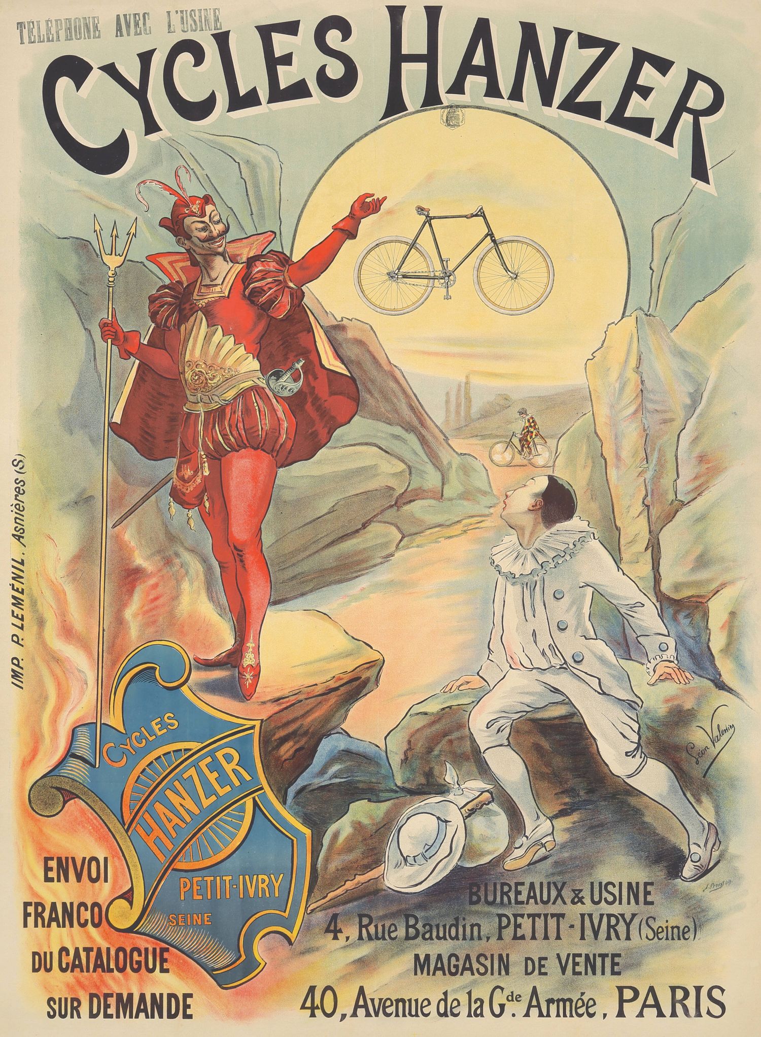 El cartel muestra una escena alegórica con una figura parecida a un diablo o sátiro y un personaje con vestimenta de Pierrot. Incluye información sobre la ubicación de la oficina, la fábrica y la tienda de venta de Cycles Hanzer en Petit-Ivry y París. También menciona la posibilidad de solicitar un catálogo de forma gratuita.