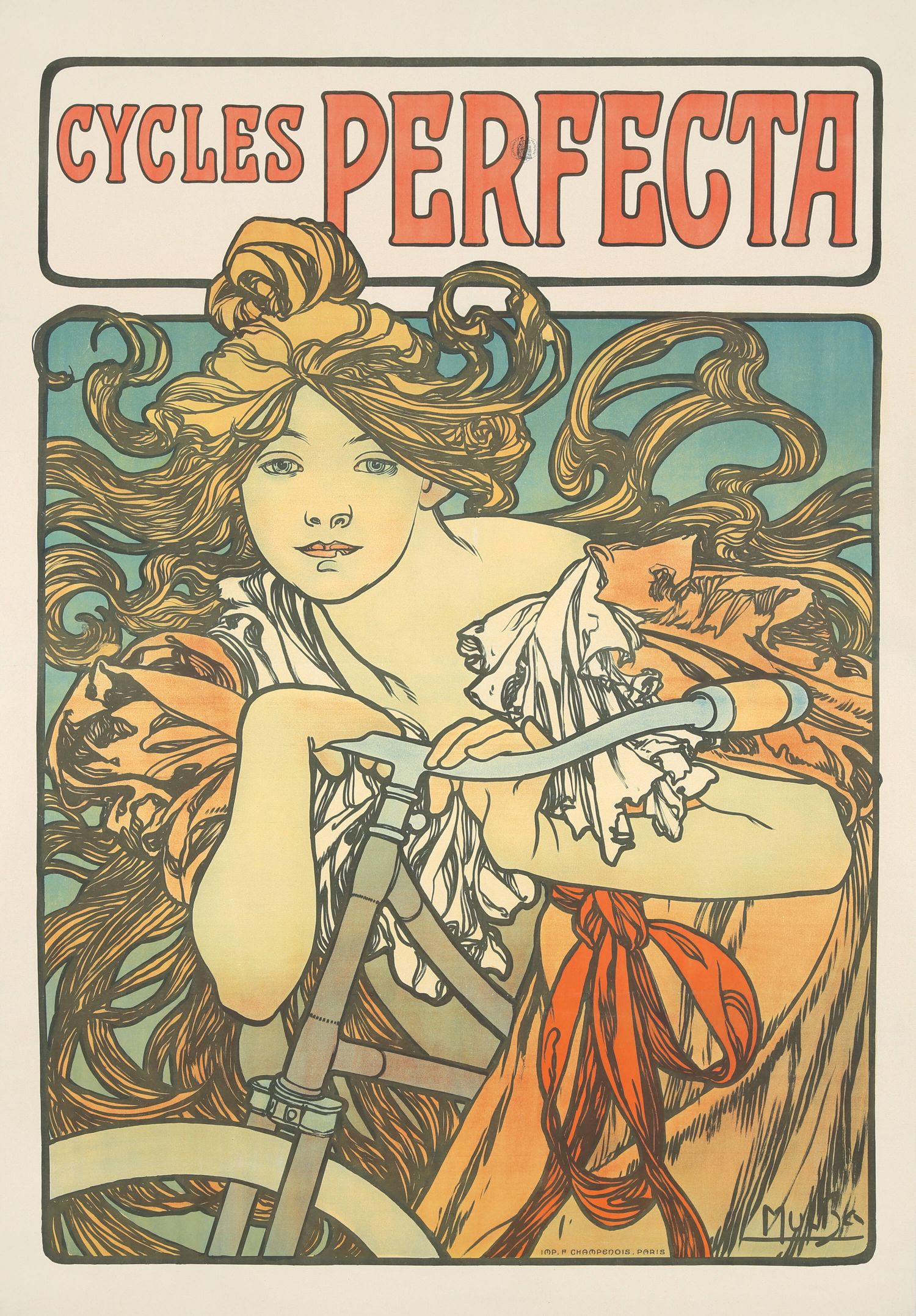 Póster "Cycles Perfecta" de Alphonse Mucha (1860-1939), diseñado en 1902 como anuncio para la compañía británica de bicicletas "Cycles Perfecta". Es un icónico ejemplo del estilo Art Nouveau.