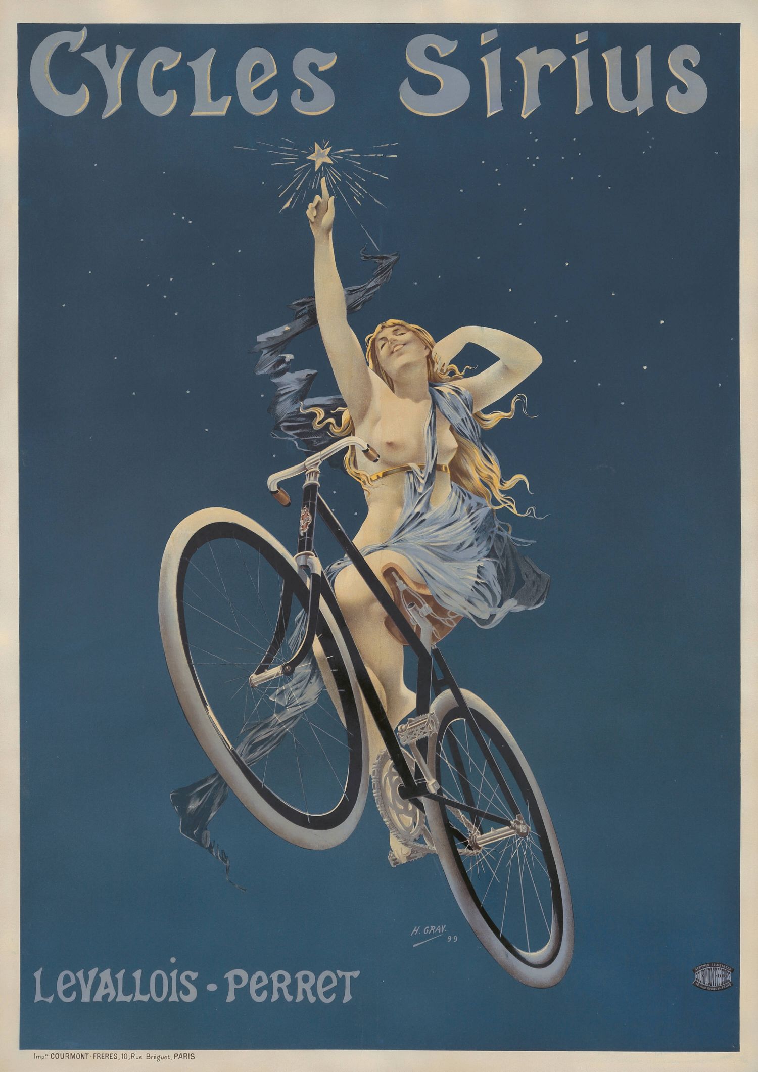 Póster publicitario vintage de "Cycles Sirius", creado en 1899 por el artista Henri Gray (también conocido como Henri Boulanger). La empresa Cycles Sirius se ubicaba en 14 & 16 Rue Duret, París.