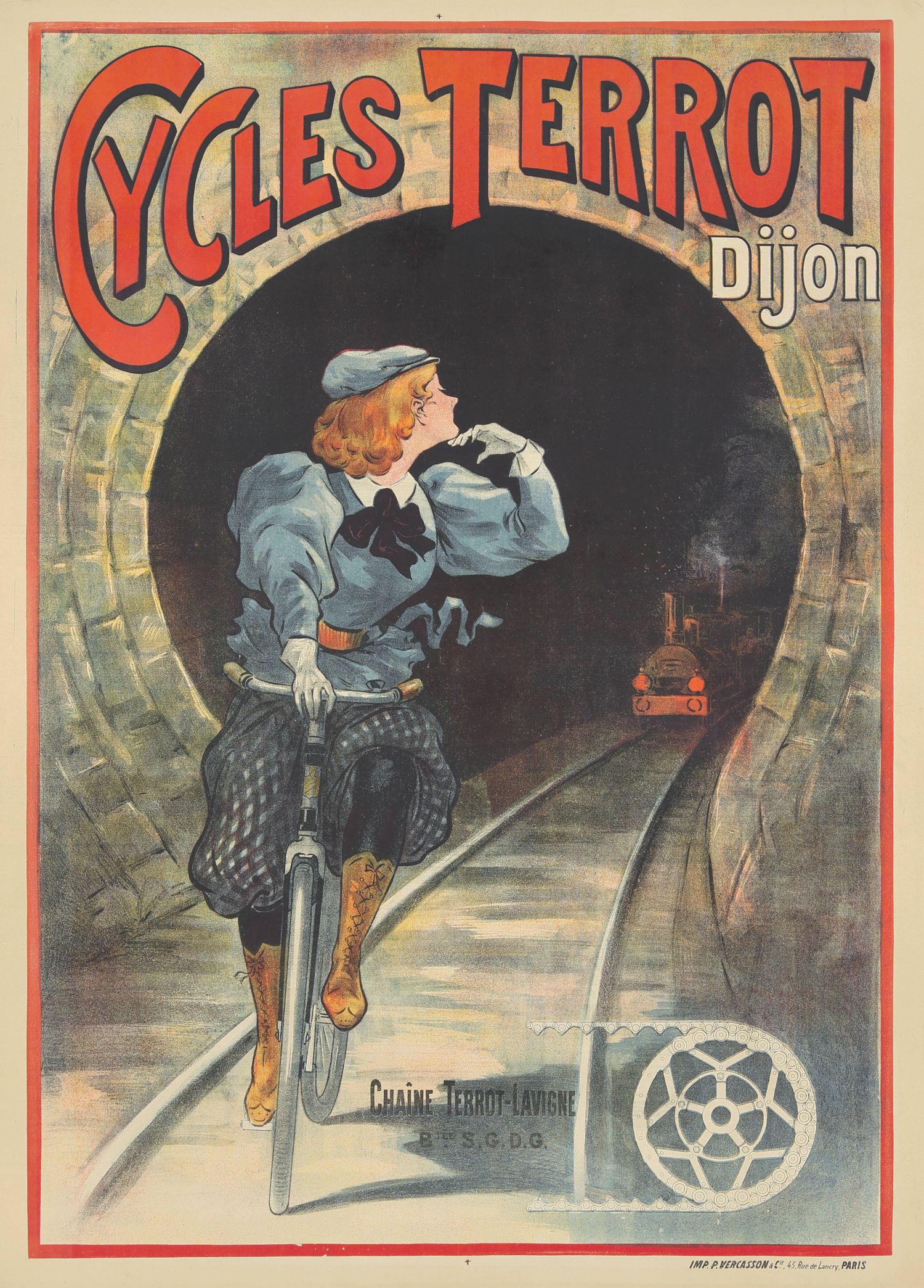 Póster antiguo de 1898, obra de Francisco Tamagno (1851-1933), promociona las bicicletas y automóviles de la marca francesa "Terrot" de Dijon, un fabricante clave de vehículos de dos ruedas. El póster, en estilo Art Nouveau, muestra a una mujer elegante en bicicleta con la 'Chaîne Terrot-Lavigne' superando a un tren, simbolizando modernidad y velocidad. También destaca la "T.C.F. Seule Médaille d'Or" recibida por Terrot. Es valorado por su diseño artístico e importancia histórica, reflejando la cultura publicitaria de principios del siglo XX. Hoy en día, los productos antiguos de Terrot son muy buscados por coleccionistas.