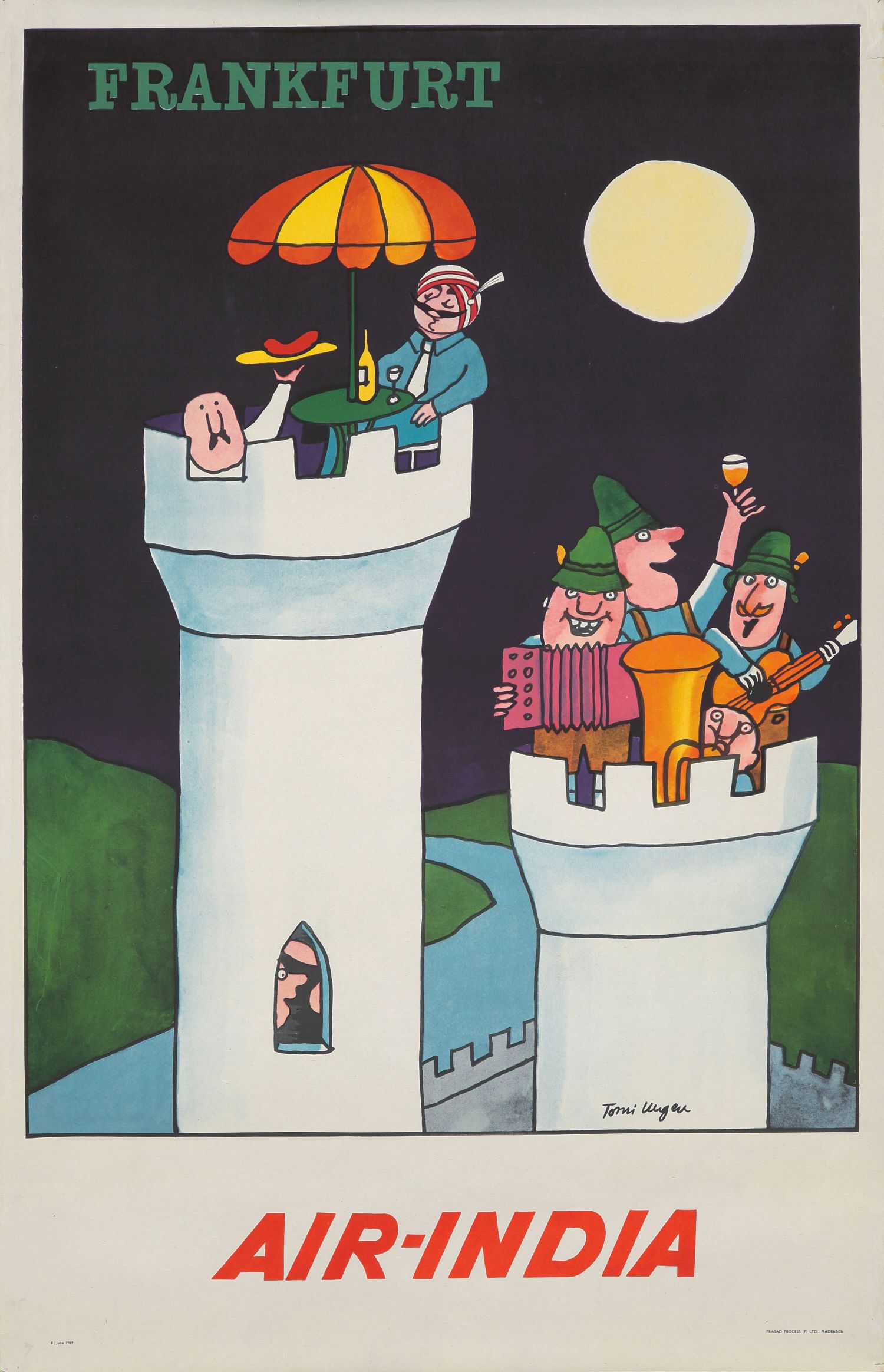Póster publicitario de Air India para el destino Frankfurt, diseñado por el reconocido artista Tomi Ungerer. La obra exhibe el distintivo estilo caricaturesco de Ungerer, famoso por sus ilustraciones ingeniosas y a menudo satíricas.