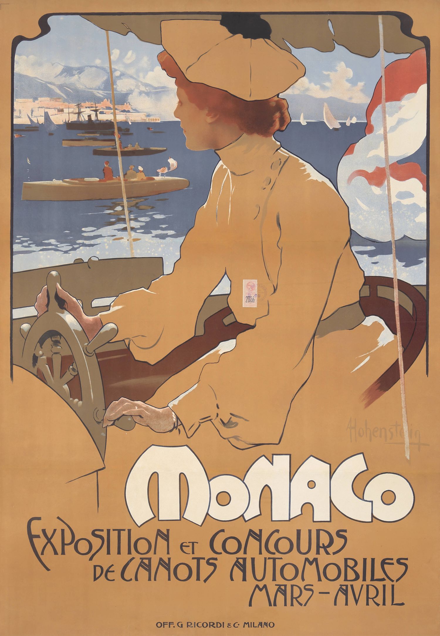 Este cartel artístico original de Adolfo Hohenstein promociona la "Exposición y Concurso de Canots Automobiles" (Lanchas Automóviles) celebrada en Mónaco durante marzo y abril de 1900. Impreso por G. Ricordi & C. Milano, la obra muestra a una mujer al timón de una embarcación, con otras lanchas y el paisaje costero de Mónaco de fondo. Hohenstein, un destacado diseñador gráfico y litógrafo, imprimió en este cartel su característico estilo Art Nouveau. Este tipo de piezas son muy valoradas por su diseño y su relevancia histórica en la publicidad y el arte de la época.