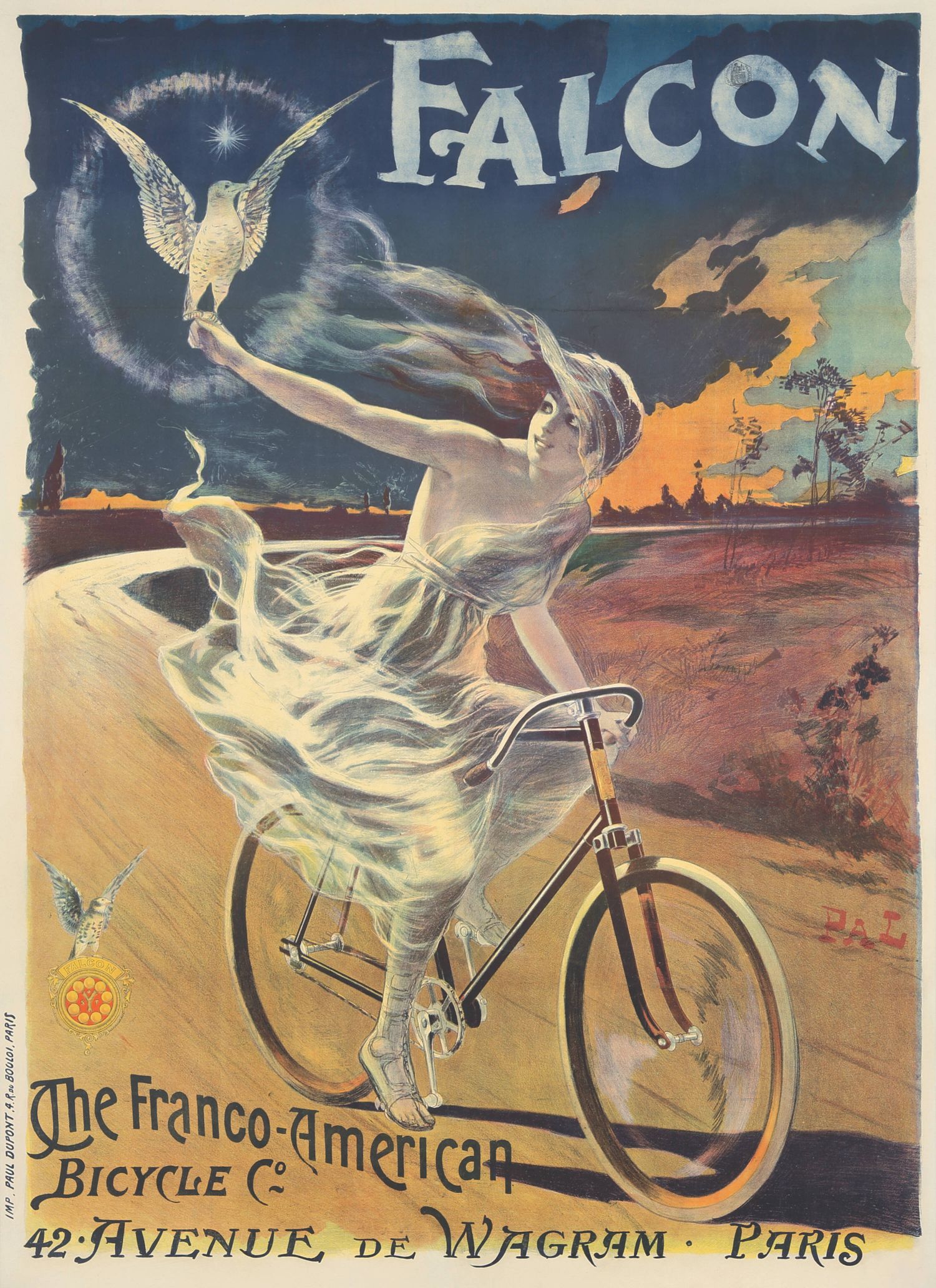 Este es un póster publicitario vintage de "Falcon, The Franco-American Bicycle Co.", creado por el artista Jean de Paléologue (1855-1942), conocido por su seudónimo "PAL", alrededor de 1896. La imagen cuenta con la dirección de The Franco-American Bicycle en aquellos años (42 Avenue de Wagram, Paris)