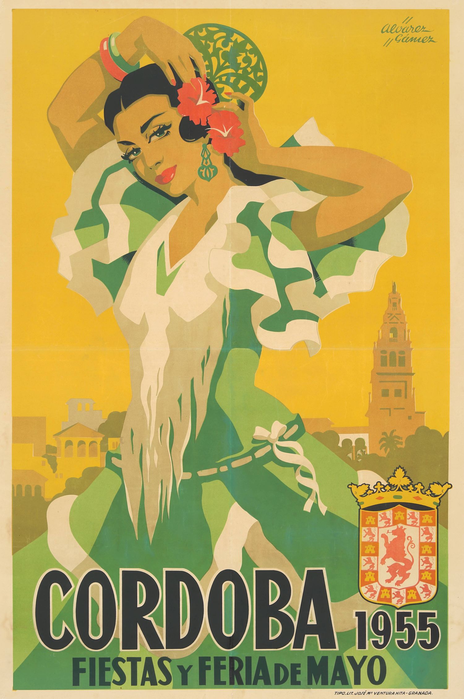 Poster vintage de Álvarez Gámez, diseñado en 1955, anuncia las Fiestas y Feria de Mayo de Córdoba, celebraciones anuales en esta ciudad de Andalucía, España. La pieza central es una bailaora flamenca, rodeada de elementos arquitectónicos distintivos de Córdoba y el escudo de la ciudad, capturando la esencia cultural y festiva del evento.