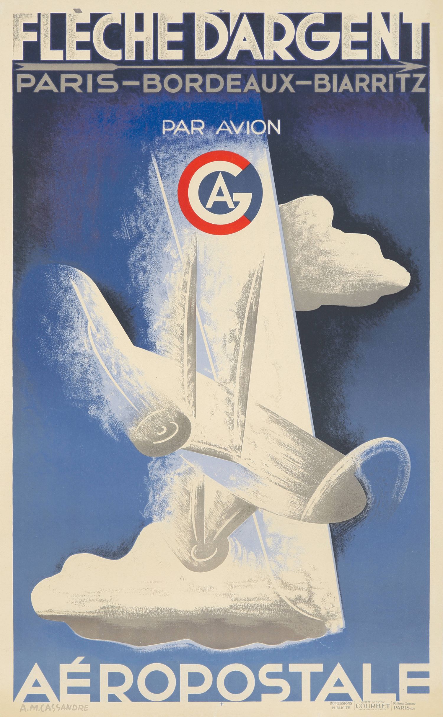 Este cartel vintage diseñado de 1936 por A.M. Cassandre (1901-1968), fue creado en 1930 y buscaba promocionar la ruta aérea París-Burdeos-Biarritz de Aéropostale (compañía francesa pionera en el transporte de correo aéreo, y pasajeros, destacó por rutas innovadoras y pilotos audaces.