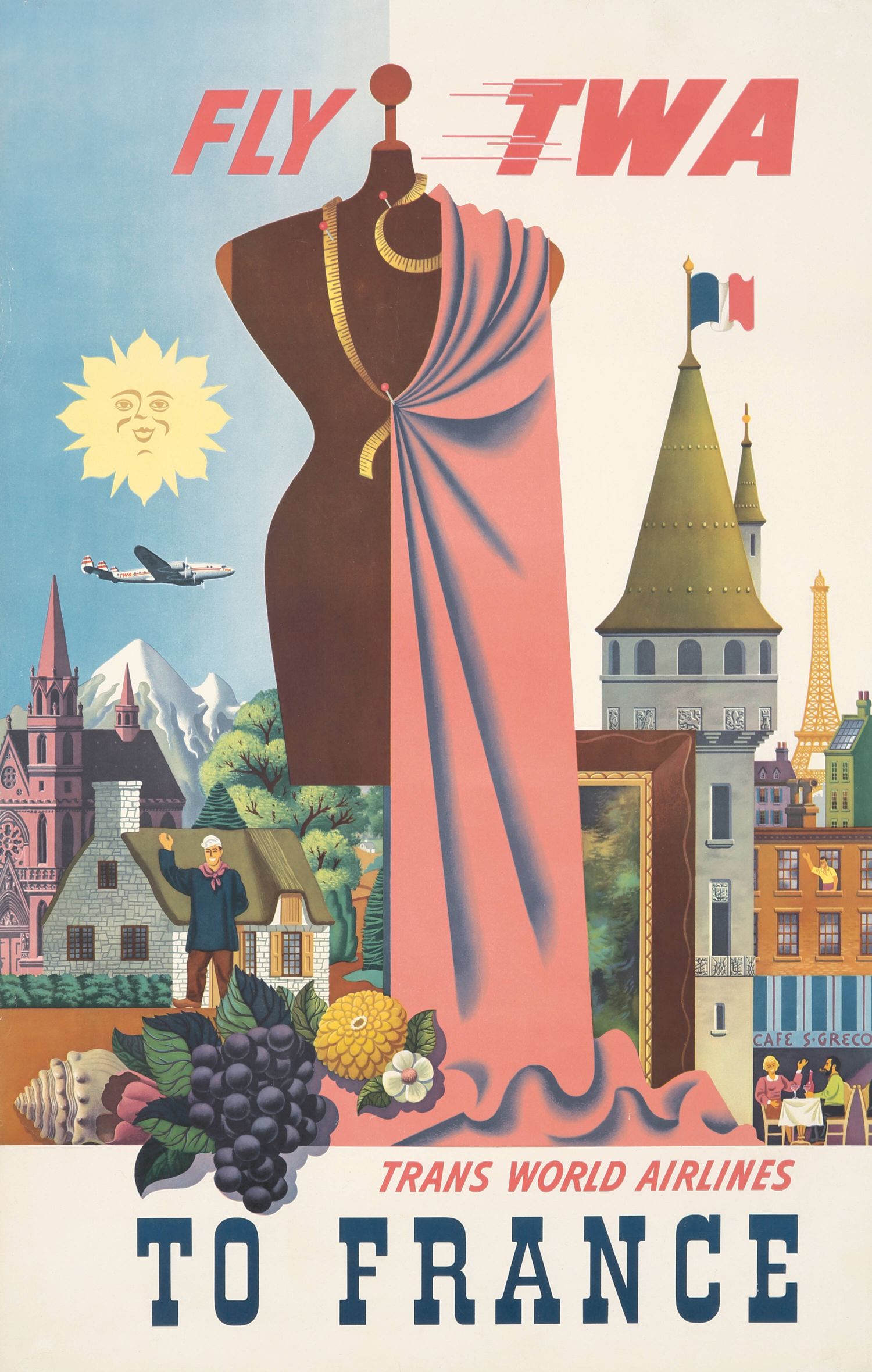 La imagen presenta un maniquí de costura con un vestido elegante, uvas, flores y conchas, junto con un avión Constellation de TWA volando sobre un idílico paisaje francés. TWA, una importante aerolínea que operó desde 1930 hasta 2001, utilizó este tipo de carteles para evocar el encanto y la sofisticación de sus destinos.