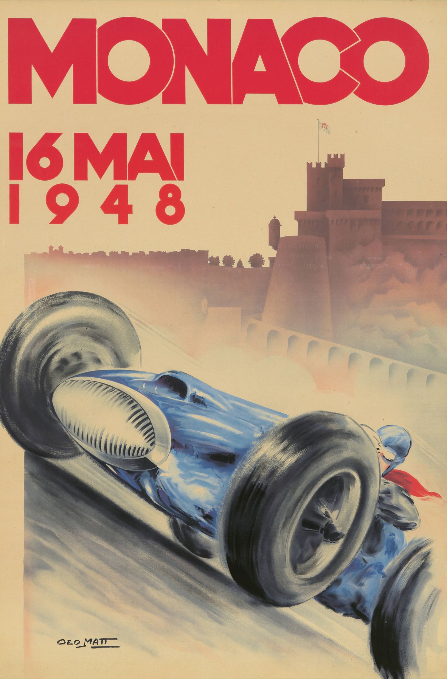 Este póster, diseñado por Géo Ham (Georges Hamel, 1900-1972), conmemora el Gran Premio de Mónaco de 1948, un evento histórico que marcó el regreso de la carrera después de 11 años, señalando el fin de la Segunda Guerra Mundial y el inicio de una nueva era en el automovilismo. Fue la primera carrera bajo la nueva fórmula de la FIA (permitiendo motores de 1.5 litros sobrealimentados o 4.5 litros de aspiración natural), y se celebró el 16 de mayo de 1948. La victoria fue para el italiano Emilio Giuseppe Farina (Nino Farina) en un Maserati 4CLT. Curiosamente, Géo Ham firmó esta obra como "Geo Matt" por razones que aún se desconocen.