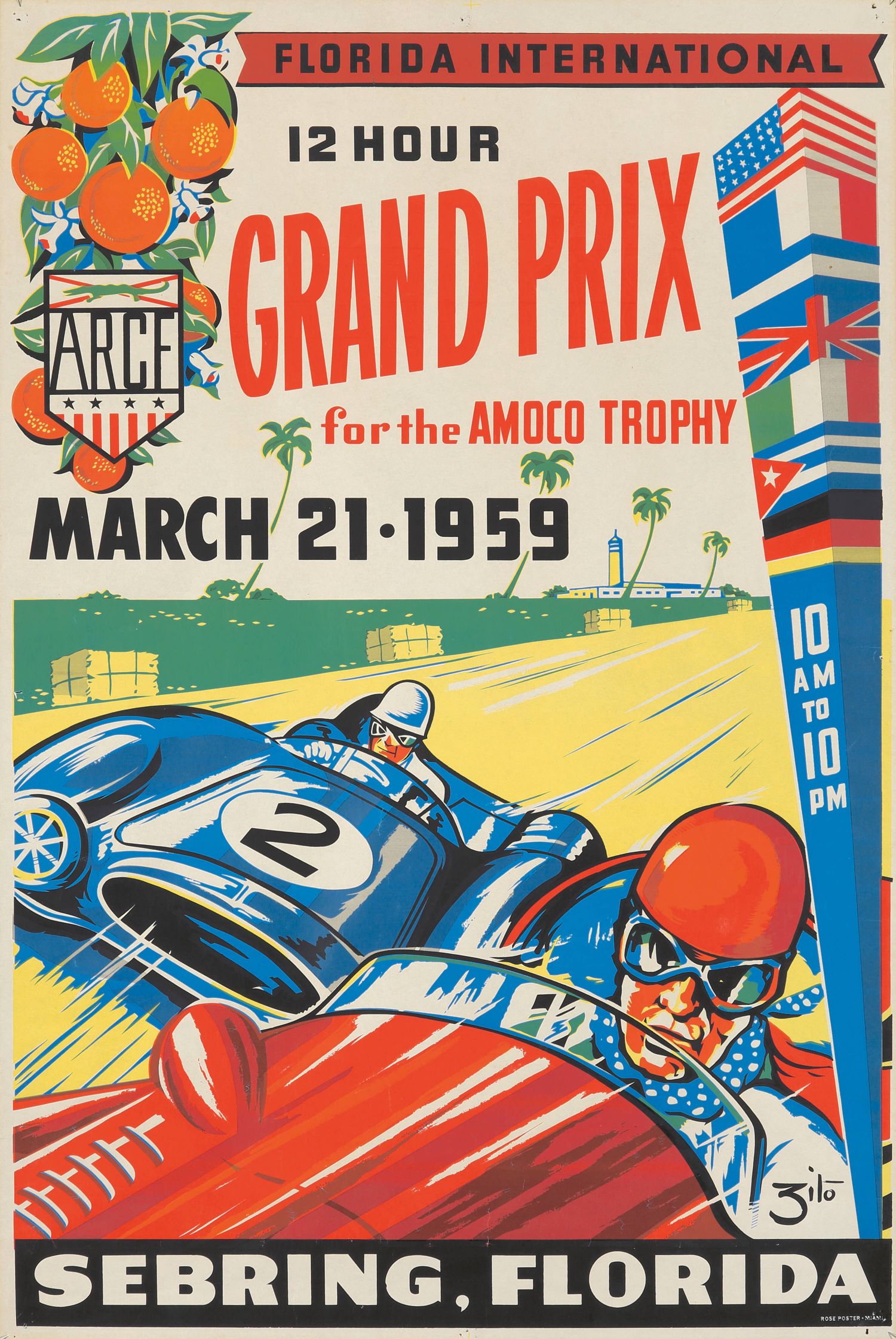 Este póster promociona el Gran Premio de 12 Horas de Sebring de 1959, que se celebró el 21 de marzo en Sebring, Florida.