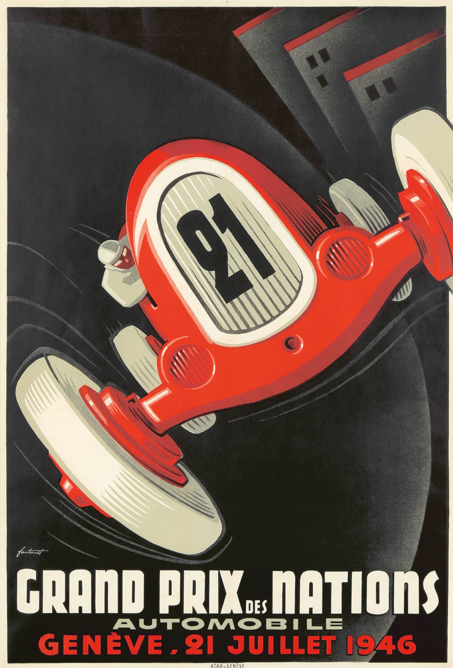 Póster publicitario vintage para el "Gran Premio de las Naciones de Automóviles" ("Grand Prix des Nations de Automóviles" en francés), celebrado en Ginebra el 21 de julio de 1946. El autor es Noël Fontanet, un artista suizo nacido en 1898 y fallecido en 1982.