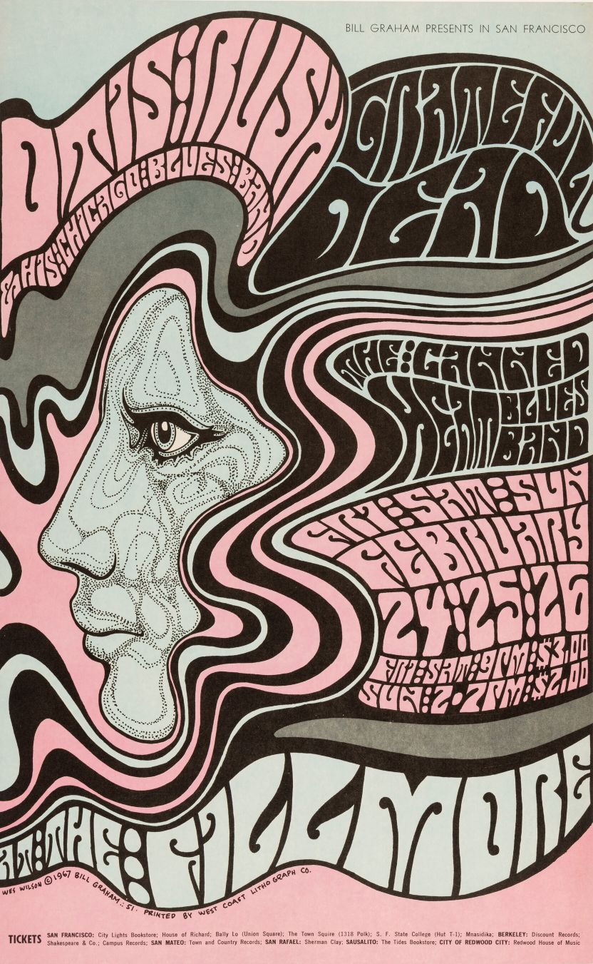 The Grateful Dead en concierto en Fillmore West (1967) en impresión artística. Tamaños 30x50 a 60x80 y acabados Lámina, Bastidor o Con Marco. Compra en posterartchile.com