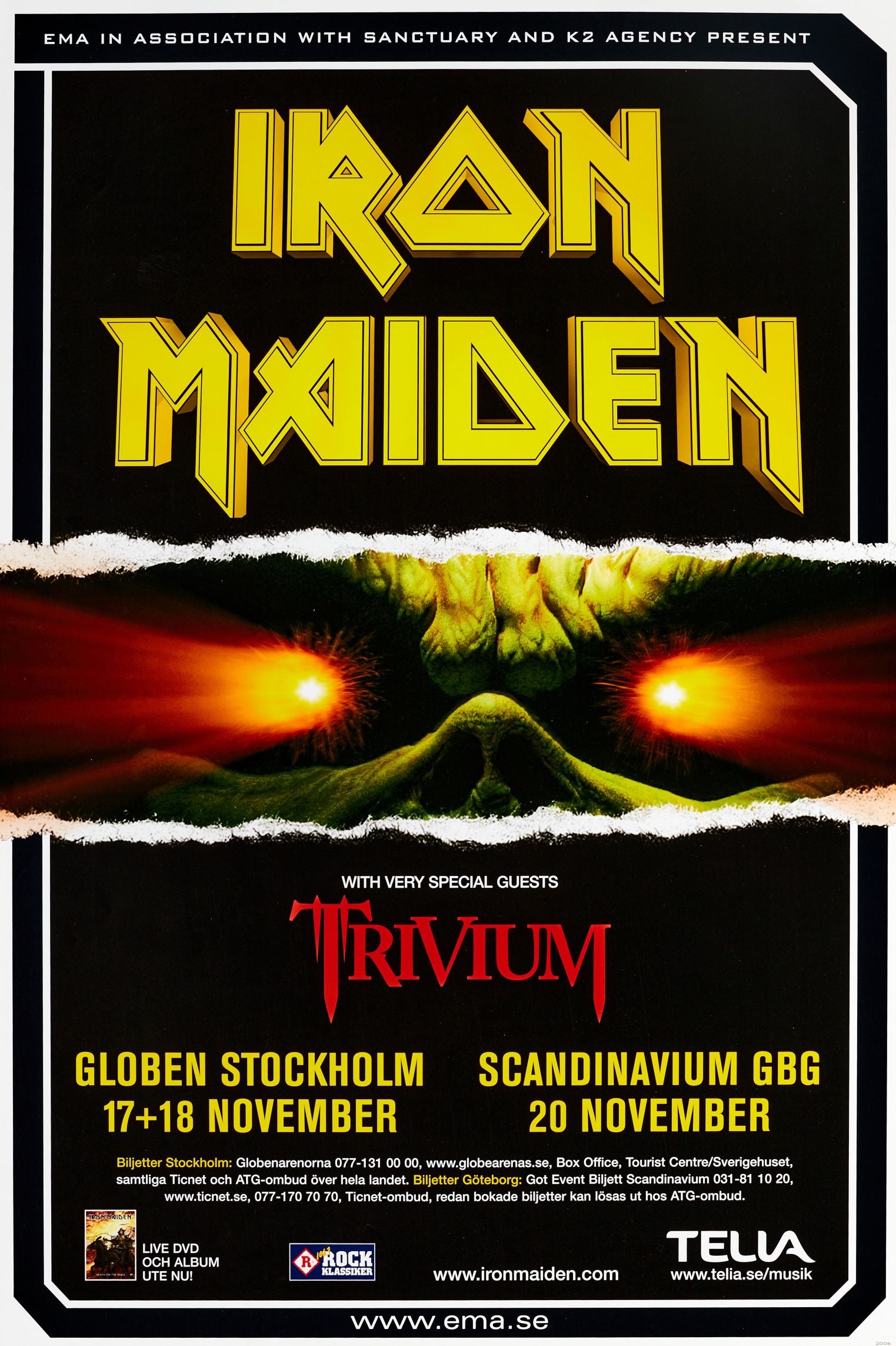 Revive Woodstock, siente el fuego de AC/DC o este poster de La Doncella de Hierro, con Trivium como invitado, para su concierto en Suecia, en noviembre de 1996. Estos pósters no solo decoran, hablan de tu pasión por la música 🎸🎤.