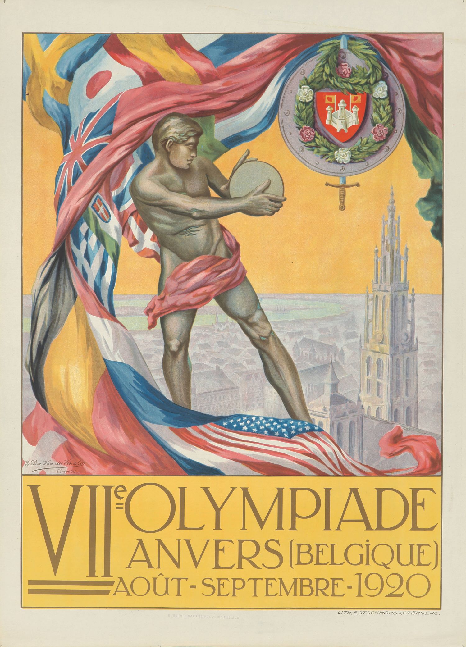 Este póster promociona los Juegos Olímpicos de Verano de 1920, oficialmente conocidos como los Juegos de la VII Olimpiada, que se celebraron en Amberes, Bélgica. Diseñado por Walter Van der Ven (1884-1923) en el mismo año de los juegos, el póster representa un homenaje al sufrimiento del pueblo belga durante la Primera Guerra Mundial y marcó el esperado regreso de los Juegos Olímpicos tras la interrupción de 1916.