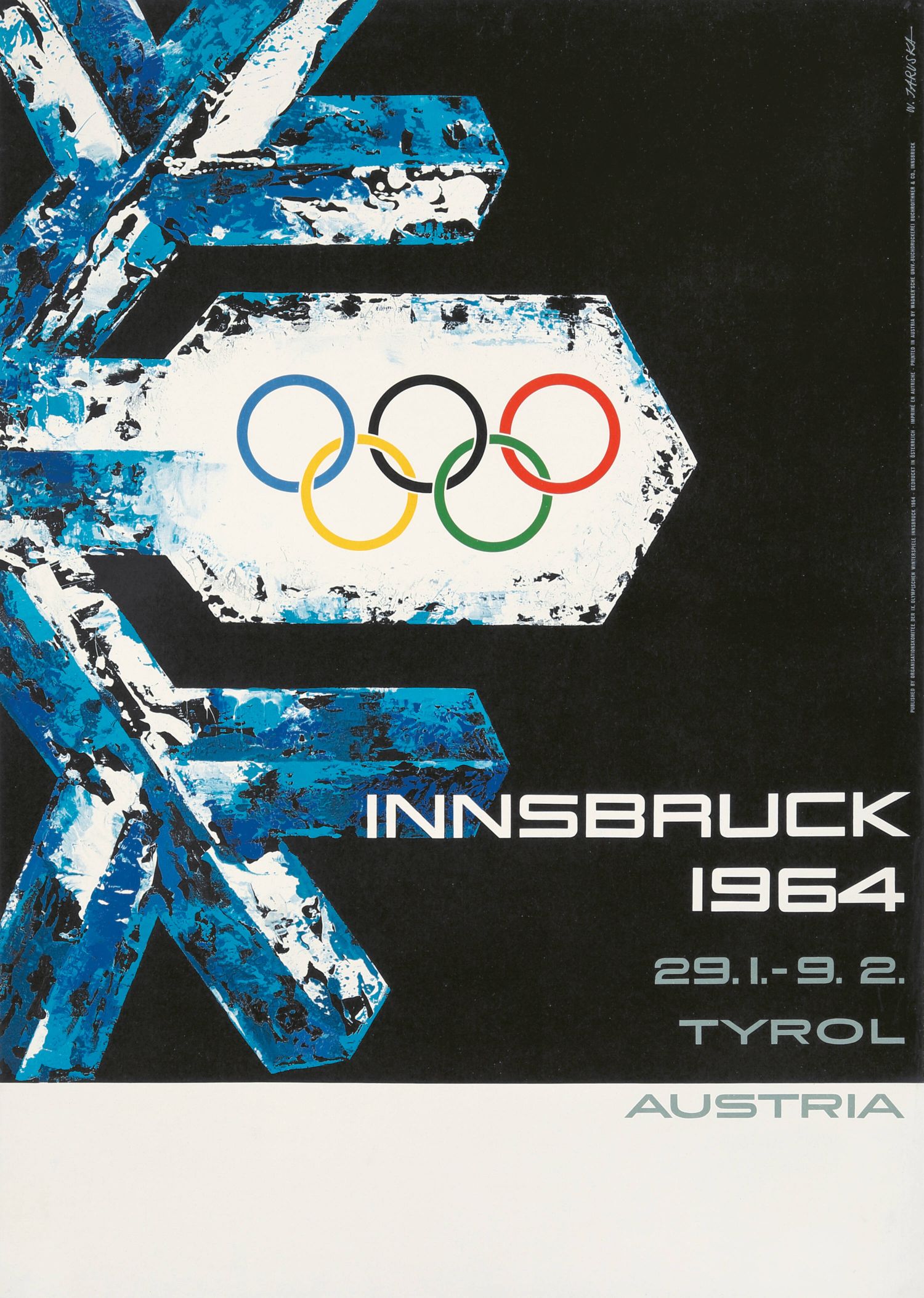 Este es el póster oficial de los IX Juegos Olímpicos de Invierno, celebrados en Innsbruck, Austria, del 29 de enero al 9 de febrero de 1964. El artista austriaco Wilhelm Jaruska (1916-2008) fue el encargado de crear el diseño del cartel, que presenta un cristal de hielo estilizado junto a los icónicos anillos olímpicos.