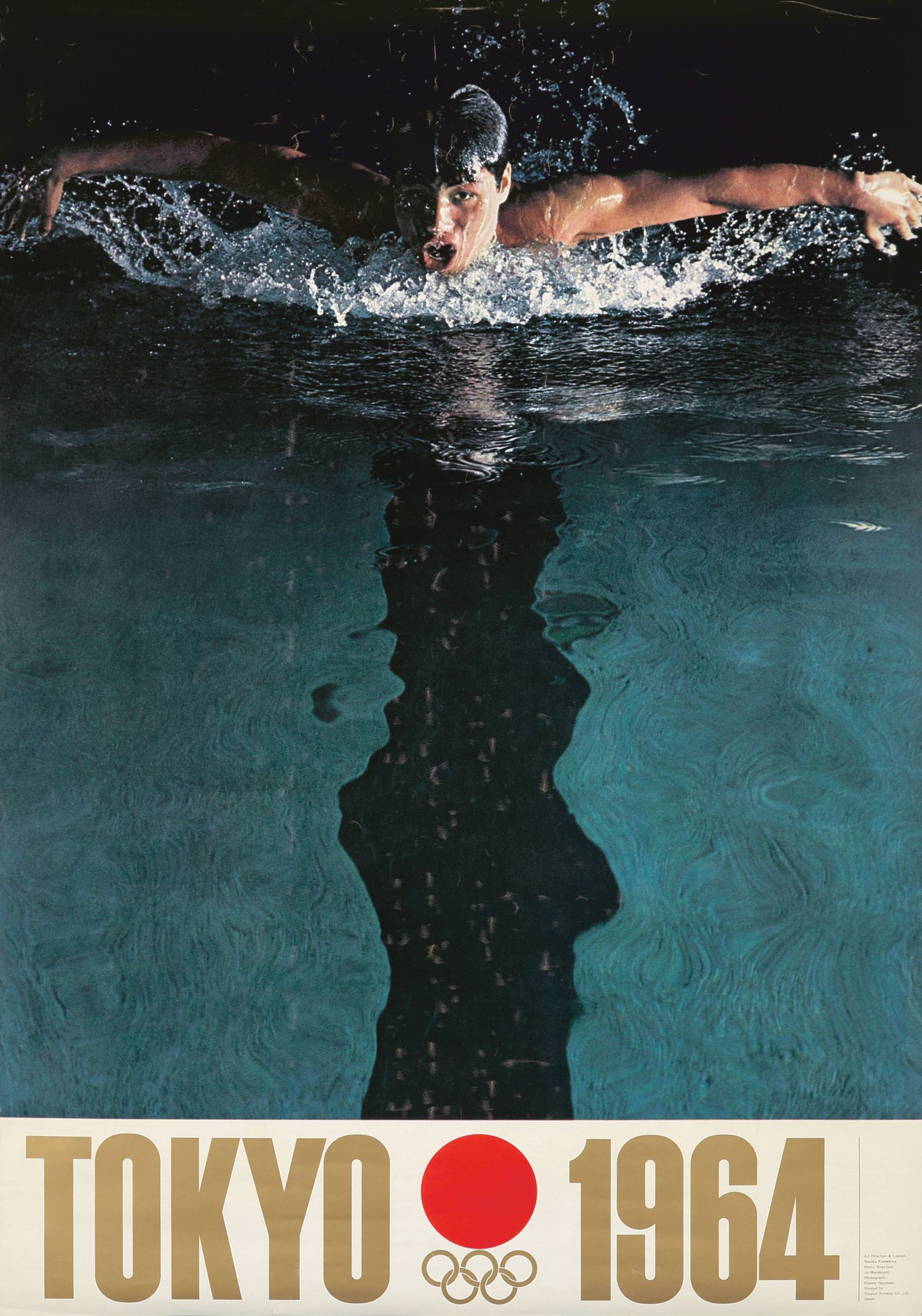 Este es uno de los pósteres oficiales de los Juegos Olímpicos de Tokio 1964, diseñado por el japonés Yusaku Kamekura (1915-1997). Este cartel es uno de los cuatro pósteres oficiales creados para los Juegos y marcó un hito al ser la primera vez que se utilizó la fotografía en los pósteres olímpicos, destacando la imagen de un nadador mariposa.