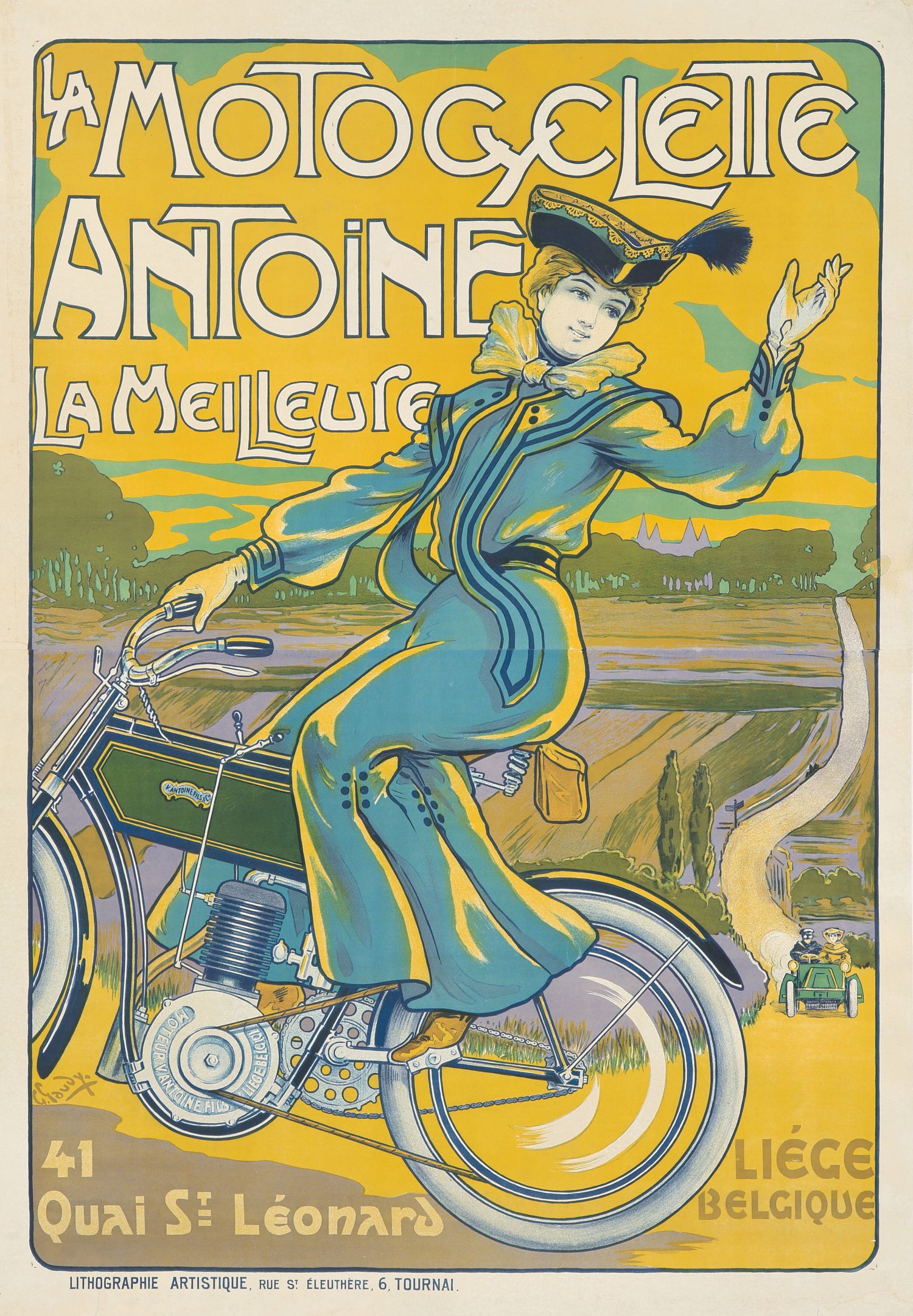 Este es un póster publicitario antiguo de "La Motocyclette Antoine", creado por el artista Georges Gaudy (1872–1940). El cartel promociona…