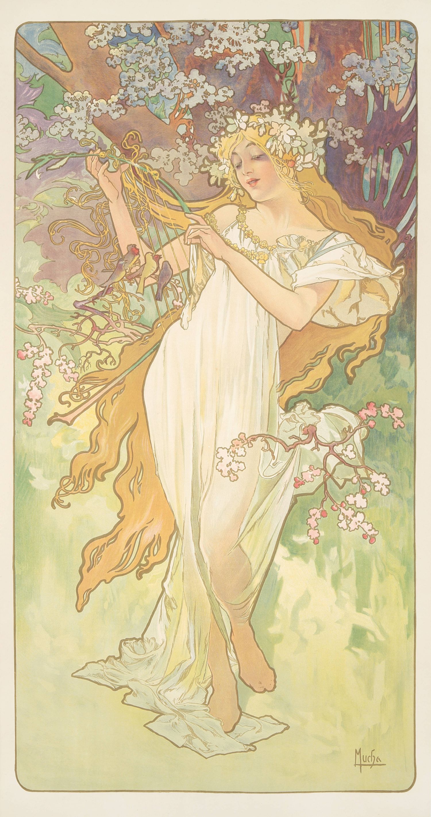 Esta imagen es una de las litografías de la serie "Las Estaciones" de Alphonse Mucha (1860-1939), específicamente la que representa la Primavera. Esta obra forma parte de una de las tres series de litografías en color que el artista checo produjo con el tema de las estaciones, realizadas en 1896, 1897 y 1900.