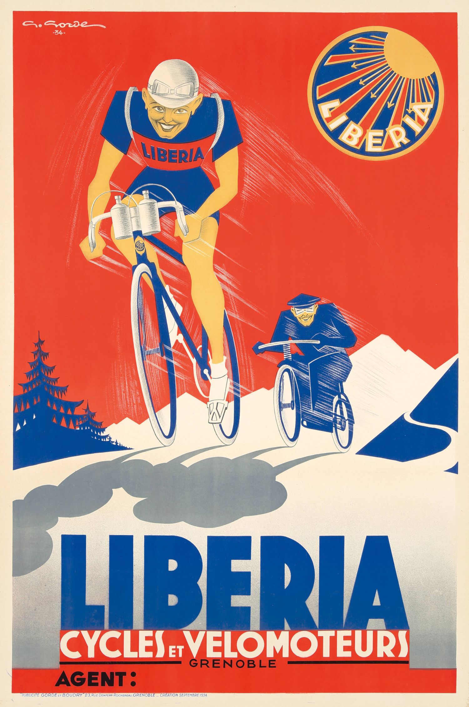 Este es un póster Art Decó de 1934, diseñado por el artista Gaston Gorde, que anuncia la marca francesa de bicicletas y ciclomotores Liberia Cycles et Vélomoteurs. Fundada en 1918, Liberia fue una reconocida marca francesa, y este cartel fue creado en una época en la que la bicicleta era un medio de transporte predominante, con la marca teniendo una fuerte presencia en el circuito de carreras, patrocinando equipos y ciclistas.