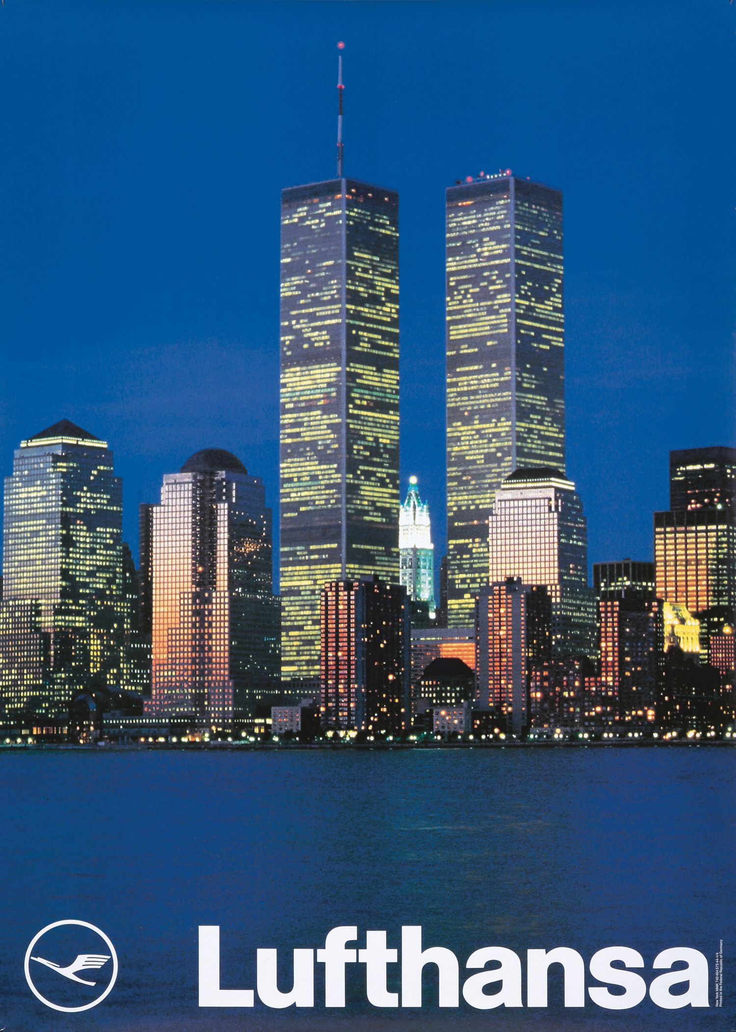 Lufthansa – Torres Gemelas al Anochecer en impresión artística. Tamaños 30x50 a 60x80 y acabados Lámina, Bastidor o Con Marco. Compra en posterartchile.com