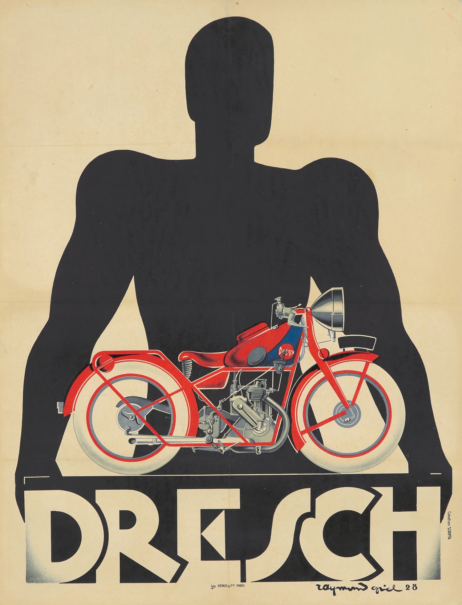 Este póster publicitario vintage, de 1928, de la motocicleta Dresch, diseñado por el artista francés Raymond Gid (1905–2000).
